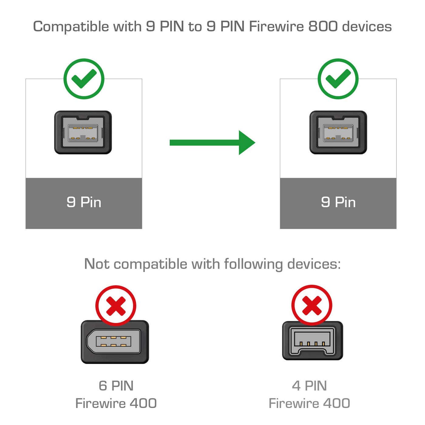 Ieee-1394B Firewire 800 Beta 9 Pin To 9 Pin Male To Male Cable - 6 Feet Black This Specific Cable Features Firewire 9-Pin Connectors On Either End, Suitable For Most Connections To Computers Or Other Devices Such Asdigital Cameras, Network Attached Storage Devices, External Hard Drives, And Printers Which Use The Original Ieee-1394B Standard Betterknown As Firewire 800 Beta. The Ieee 1394B Serial Interface, Better Known As Firewire 800, Doubles The Speed Of The Older Firewire 400.It Uses A Newer 9-Pin Beta Connector, Which Is Incompatible With Either Of The Older Connectors. The Cmple Firewire 800 Beta Cable Isdesigned To Ensure That All Of Your Ieee-1394B Equipped Devices Work At Top Efficiency For Many Years To Come. It Has The Male Beta 9-Pinconnectors Used By Firewire 800 On Each End, Is Hot Swap Compatible And Supports Plug-And-Play, So You Can Just Plug This Cable Into Thefirewire 800 Ports On Your Equipment And Youre Ready To Roll With No Data Loss, Interference Or Crosstalk Issues. And The Plug And Play/Hot Swapcompatible Design Allows You To Switch Out Cables At Will, Without Having To Worry About Your Computer Or Outboard Device Shutting Down On You.Specifications:Provides Data Transfer Rates Up To 800 Mbps Connectors: Two 9-Pin Ieee-1394B Male Connectors On Each Endhot Pluggable - Supports Plug-N-Play Operationpremium Triple-Shielded Cable With Molded Connectorsbackward Compatible With Original Firewire Systems And Devicescompatible With Pc, Mac, Sun, And Other Ieee-1394B Equipped Systemslifetime Warrantycolor: Blacklength: 6 Ft Firewire 800 Device (Firewire 800 Devices Can Achieve Firewire 800 Speeds Only When Connected To A Firewire 800 Port).These Cables Are 100% Compatible With Apple Firewire, Sony Ilink, And All Other Ieee-1394B Peripherals.