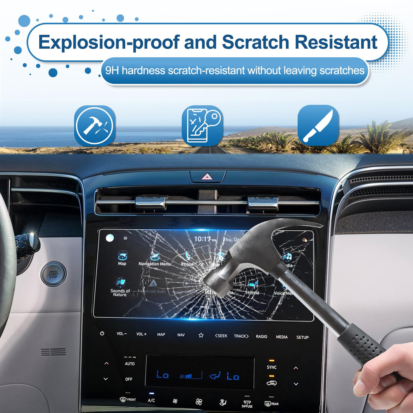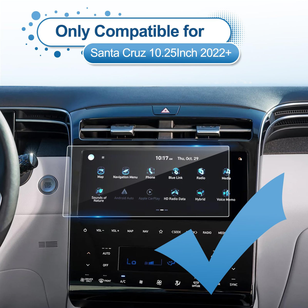 Compatible For Santa Cruz 10.25-Inch Touch Screen 2024 Santa Cruz (Sel/Night/Xrt/Limited) 2023 Santa Cruz (Se/Sel Premium/Limited) 2022 Santa Cruz (Limited) Why Choose Coleya'S Santa Cruz Tempered Glass? 1.Coleya Is A Professional Tempered Glass Company, With High-Quality Raw Materials, The Latest Technology Applications, Data Collected From Various Aspects, And Presenting High-Quality Products 2.Coleya Adopts High-Quality Tempered Glass, 2.5D Arc Edge Design, 9H Super-Hard Protection, And The Latest Thermal Induction Nanotechnology To Meet All Your Needs For Tempered Film! 3.Coleya Service, Considering The Needs Of Customers And Starting From The Actual Situation Of Customers, Can Provide Customers With Return And Exchange Services, So That Your Shopping Has No Worries! Installation Steps: 1. Compare The Protector To Your Navigation Screen. 2. Clean The Screen: Open The Kit And Clean It With A Wet Towel First, Then With A Microfiber Cloth. 3. Use Dust Removal Stickers To Remove Surface Dust And Ensure The Screen Is Completely Clean. 4. Use The Positioning Labels To Align The Protector On The Screen. Make Sure The Protector Is In The Correct Position. 5. Tear Off The Back Of The Protective Film Clockwise, Sweep Gently From The Center Of The Screen, And Wait For The Protective Film To Automatically Absorb. 6. Clean The Screen With A Microfiber Cloth, Then The Installation Is Complete. Package Included: 1 X High-Quality Tempered Glass 1 X Installation&After-Sales Manual 1 X Installation Auxiliary Tools (1*Wet Wipe, 1*Microfiber Cleaning Cloth, 1*Dust Removal Sticker, 2*Positioning Labels)