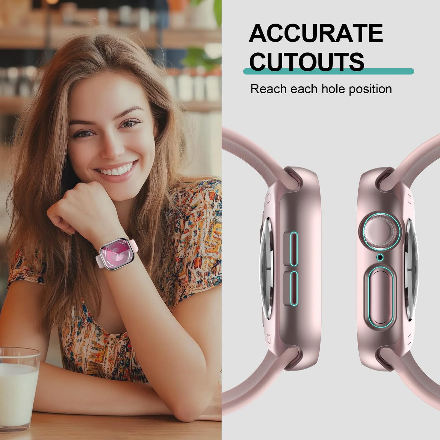 Q: How does the screen protector protect my Apple Watch?A: The screen protector features a hard PC case and built-in tempered glass film that provides full defense against dust, dirt, scratches, and damages, ensuring your Apple Watch remains in pristine condition.