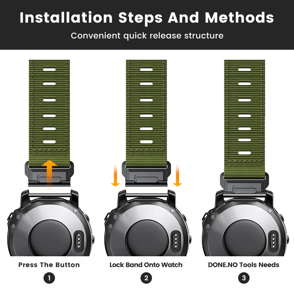 Fenix 6 Watch Band Compatible With Garmin Fenix 6/Fenix 7/Fenix 5/Fenix 6 Pro/Epix Gen 2/Instinct/Forerunner 965/945/745/955/935/Descent G1/Marq Adventurer/Quatix 7(Not For Fenix 6S / 5S / Fenix 6X / 6X Pro/ Fenix 5X / 5X Pro!) ?Premium Materials?Nylon Band 22Mm Is Made Of High Quality Nylon With Stainless Steel Buckle, Breathable, Durable And Lightweight. It Is Ultra-Light, Soft, Very Rugged. And It Has Precise Fitting Connectors, Quick Disassembly Structure And Screw Rod Locking Method. It Can Accurately And Safely Lock Watch Band ?Easy Install And Removal?Watch Band For Garmin Fenix 5 Comes With Watch Lugs On Both Ends, Which Locks Onto Watch Precisely And Securely. Direct Installation And One Button Removal Without Tool. ?Adjustable Wrist Strap?Epix Pro Gen 2 Soft Woven Sport Watch Band Suitable For Wrists Between 7.1''-8.6''(180Mm-220Mm). When Exercising, You Can Perfectly Hold The Watch Against Your Wrist For Better Exercise Readings. ?Great Customer Services?22Mm Quickfit Nylon Has One-Year Warranty. If You Have Any Questions About The Item, Please Contact Us. We Will Find The Best Solution For You Within 24 Hours.