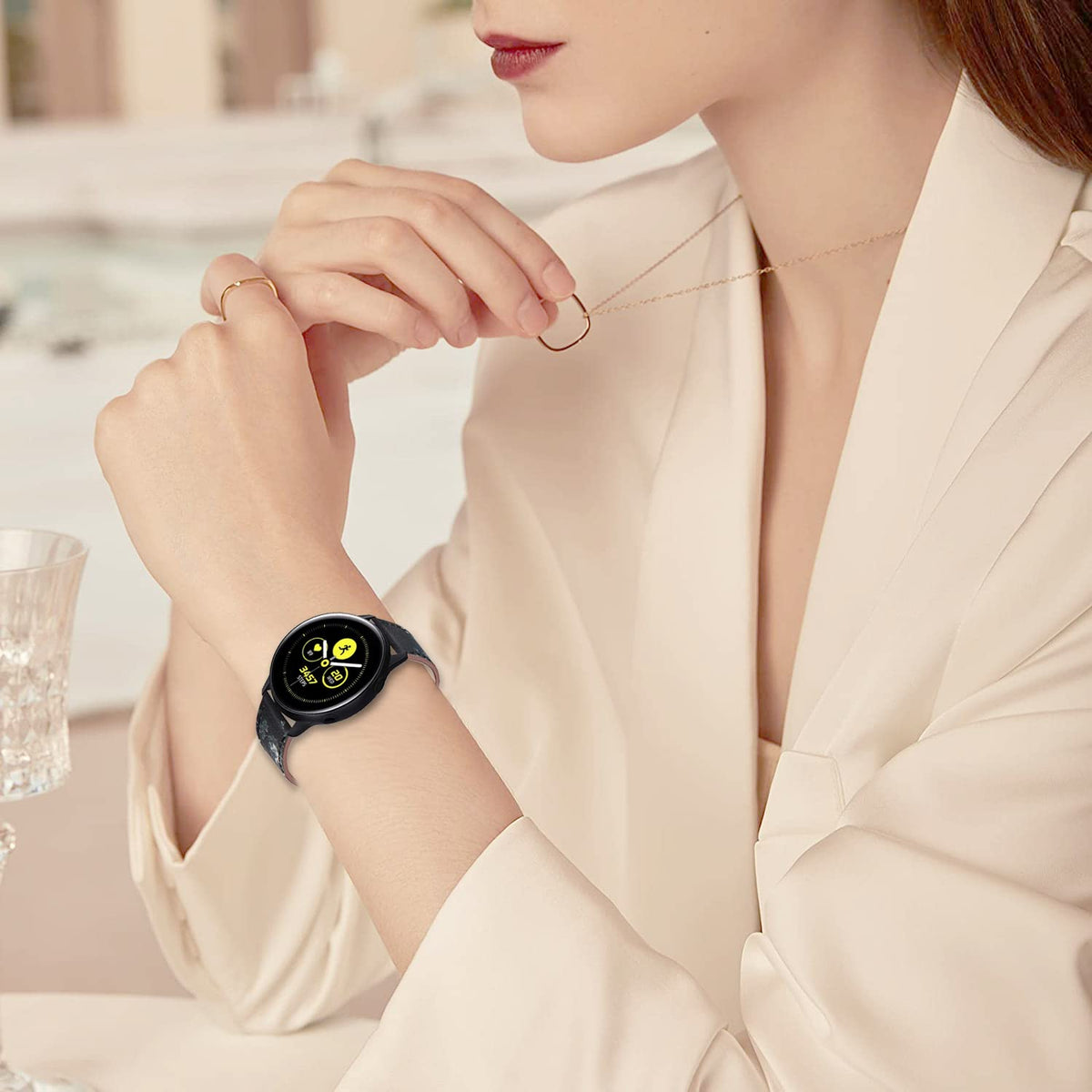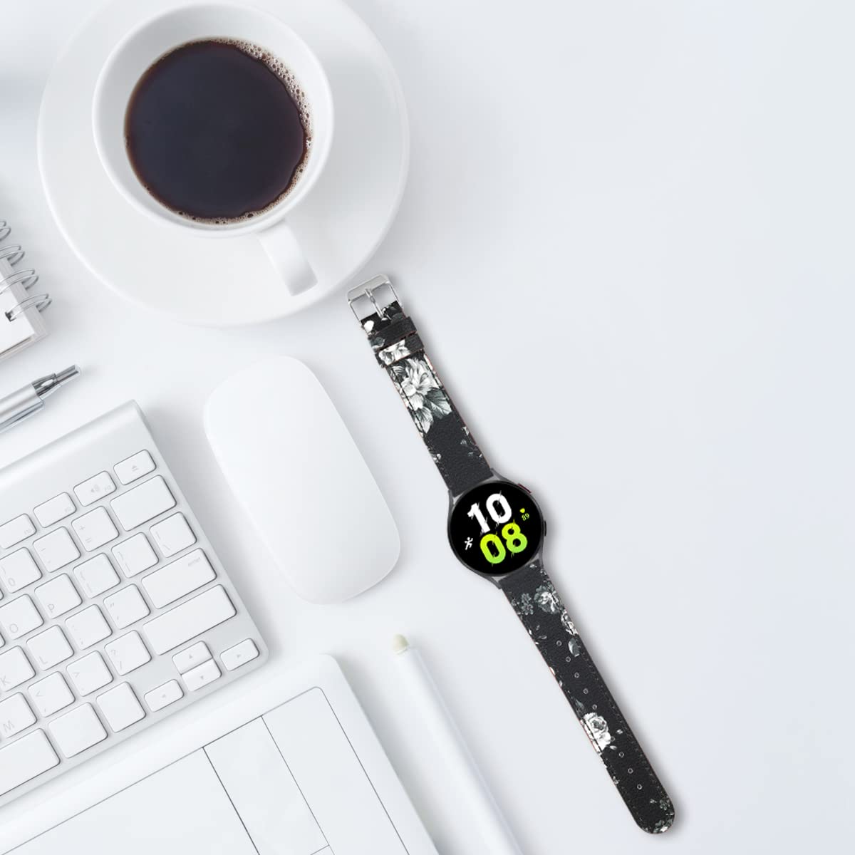 Q: Is this leather band compatible with the Samsung Galaxy Watch 5 and 4?A: Yes, this 20mm leather band is designed to be compatible with the Samsung Galaxy Watch 5 (40mm and 44mm), Galaxy Watch 4, Galaxy Watch Active 2, and other smartwatches that use 20mm spring bars.