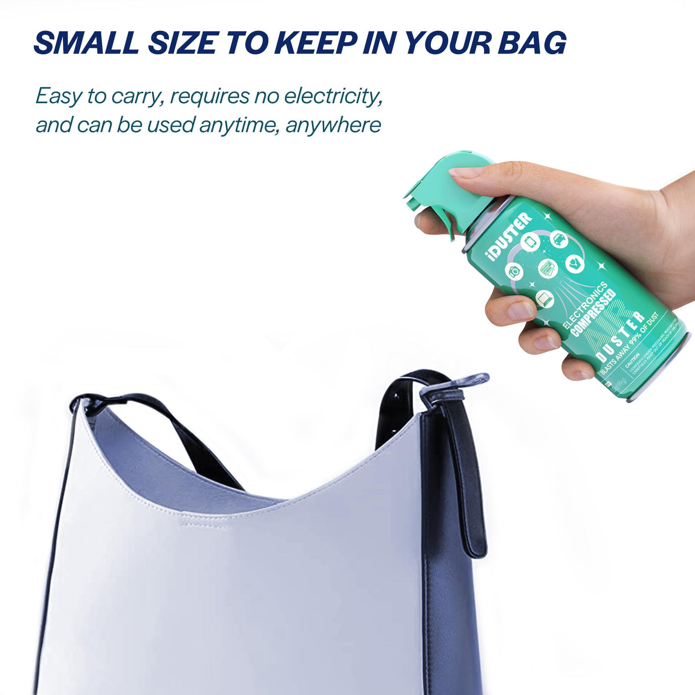 Q: What size is the iDuster air duster can?A: The iDuster air duster comes in a 3.5oz can, which is a convenient size for home or office use, making it easy to store and handle.