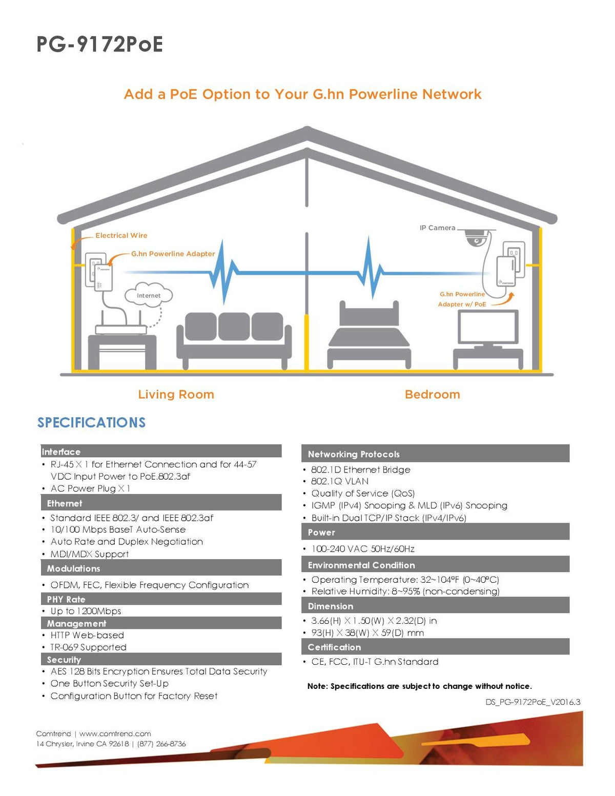Model: Pg-9172Poe Characteristics: G.Hn Power Line Adapter With Power Over Ethernet (Poe) Description Data And Power Are As Close As The Nearest Electrical Outlet. Comtrend'S Pg-9172Poe Is A G.Hn-Based Power Line Device With The Added Benefit Of Power Over Ethernet (Poe) Connectivity. Using Existing Electrical Wiring And Power Line Technology, You Can Get Data And Power Connectivity To Hard To Reach Locations Without The Expensive Installation Of Ethernet (Cat5E/6) Cables. Easily Add On To Or Create Your G.Hn Power Line Network-Connect Up To 16 G.Hn Power Line Adapters.
