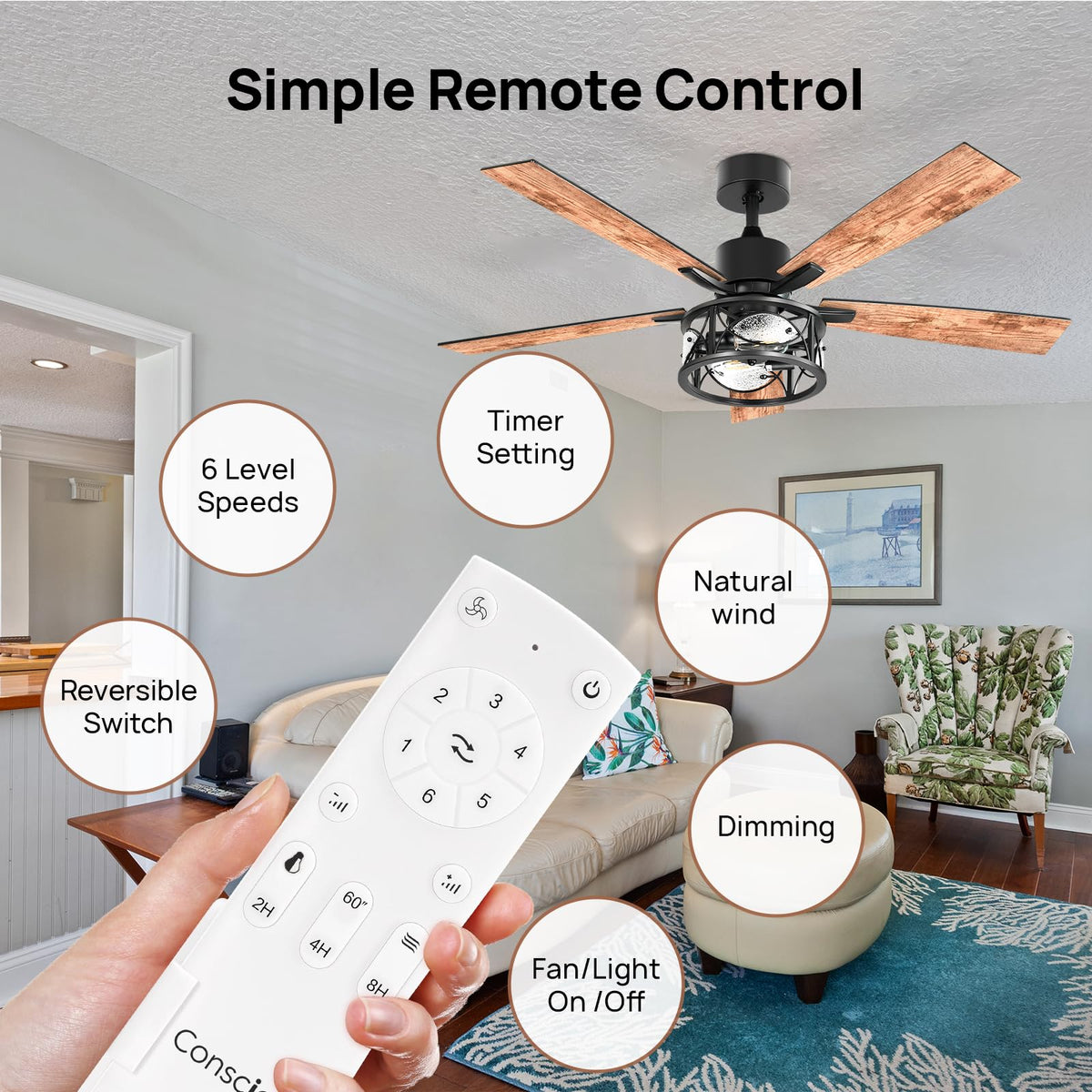 Q: What are the main features of the Consciot Ceiling Fan?A: The Consciot Ceiling Fan features a classic farmhouse style with a matte black body, 5 double-finished wood blades, and is equipped with a quiet reversible DC motor. It supports dimmable E26 bulbs (not included) and offers 6 wind speed options for optimal airflow.