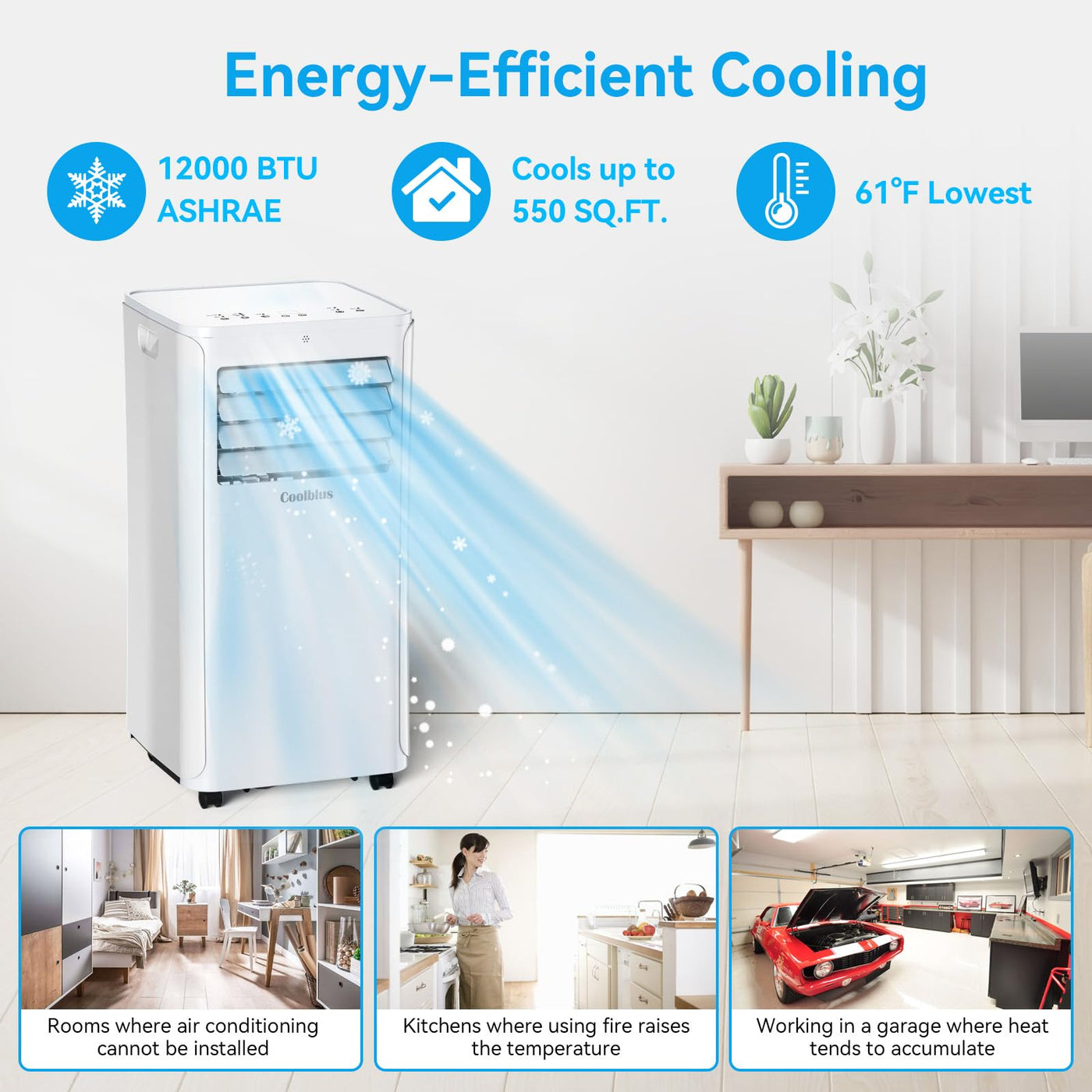 Q: What is the cooling capacity of the Coolblus A016B air conditioner?A: The Coolblus A016B air conditioner has a cooling capacity of 12000 BTU, making it suitable for cooling rooms up to 550 square feet.