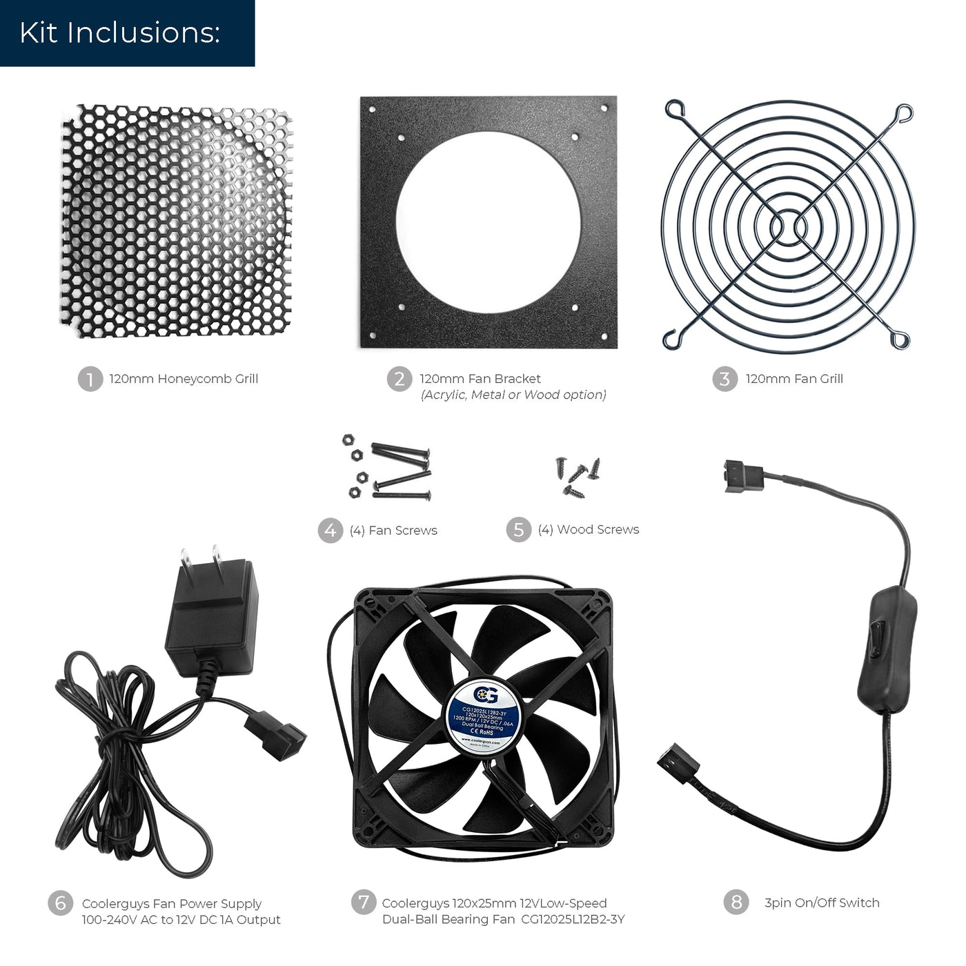 Coolerguys Single 120Mm Fan Cooling Kit This Particular Kit Is For A Single Fan Unit Meant To Cool Your Cabinet, Multimedia Center, Aquarium, Home Grow Op, Brewing Project, Or Whatever Else That May Need Cooling, The Only Limit Is Your Imagination!This Fan Can Move 46 Cubic Feet (Wxhxd) Of Air Per Minute (Cfm) Which Is Good For 1-2 Components (Up To 10 Cubic Feet Of Space With 1 Shelf), This Is Just A General Rule&Nbsp;Of Thumb And It Assumes You Have Adequate Space For Air To Flow In From, And Ventilation Between Shelving, We'Re Currently Working On An In-Depth Guide To Airflow And Cooling However In The Meantime If You Have Questions We'Re Here To&Nbsp;Help You!Can Be Mounted On Any Side Of A Cabinet, Where Room Permits (Cutout Dimensions Below). Insert The Completed Cooler Assembly In The Hole And Attach It With The Appropriate Screws. The Fan Can Be Set To Be Either An Intake Or Exhaust, Simply Mount The Fan To The Bracket Pointing In The Desired Direction Before Installing (If You Are Looking At The Label The Air Will Flow Towards You).Includes:(1)Ultra Quiet &Amp; Reliable Coolerguys Dual Ball Bearing 120Mm 3Pin 12V Fanwith Dual Ball Bearings This Fan Is Rated To Last 67,000+ Hours Running 365/24/7 (Over 7&Nbsp;Years!)The Fan Has A 30'' (760Mm) Long Cord, If You Need To Extend This Length We Have&Nbsp;Extensions Here(1)&Nbsp;Coolerguys 1A 100-240V Ac To 12V Dc Power Supplythis Is How The Fan Can Run From A Standard 2 Prong Wall Socket, Since It Is 100-240V Ac Powered It Can Be Used In Any Region If You Use Adapt To The Appropriate Plug.All Necessary Screws, Cables, And Fasteners Are Included To Assemble, Install And Operate This Unit. Total Kit Contents:(1) Coolerguys 1A 100-240V Ac To 12V Dc Power Supply(1)&Nbsp;Coolerguys Ultra Quiet 120X120X25Mm Dual Ball Bearing Low Speed Fan(1) Bracket Of Your Choosing (Acrylic, Metal Or Wood)(1)&Nbsp;Black 120Mm Honeycomb Mesh Fan Grill(1)&Nbsp;Black 120Mm Fan Grill(8)&Nbsp;Fan Nuts And Bolts(4) #6 - 1/2'' Black Cabinet Screws(1)&Nbsp;Coolerguys 3Pin On/Off Switch Product Specifications:Fan Speed:&Nbsp;1200 Rpmoperation Voltage:&Nbsp;6.5~13.8 Voltsinput Current:&Nbsp;0.10Aoperation Temperature: -10 To +65 Cstorage Temperature:&Nbsp;-40 To +70 Cairflow:&Nbsp;46 Cfmnoise Level:&Nbsp;20.4 Dbalifespan Is Based On The Operating Temperature Of 95F (35C) We Trust In Our Products At Coolerguys And Test Everything That Is Sent Out!