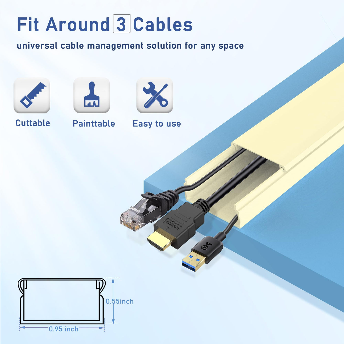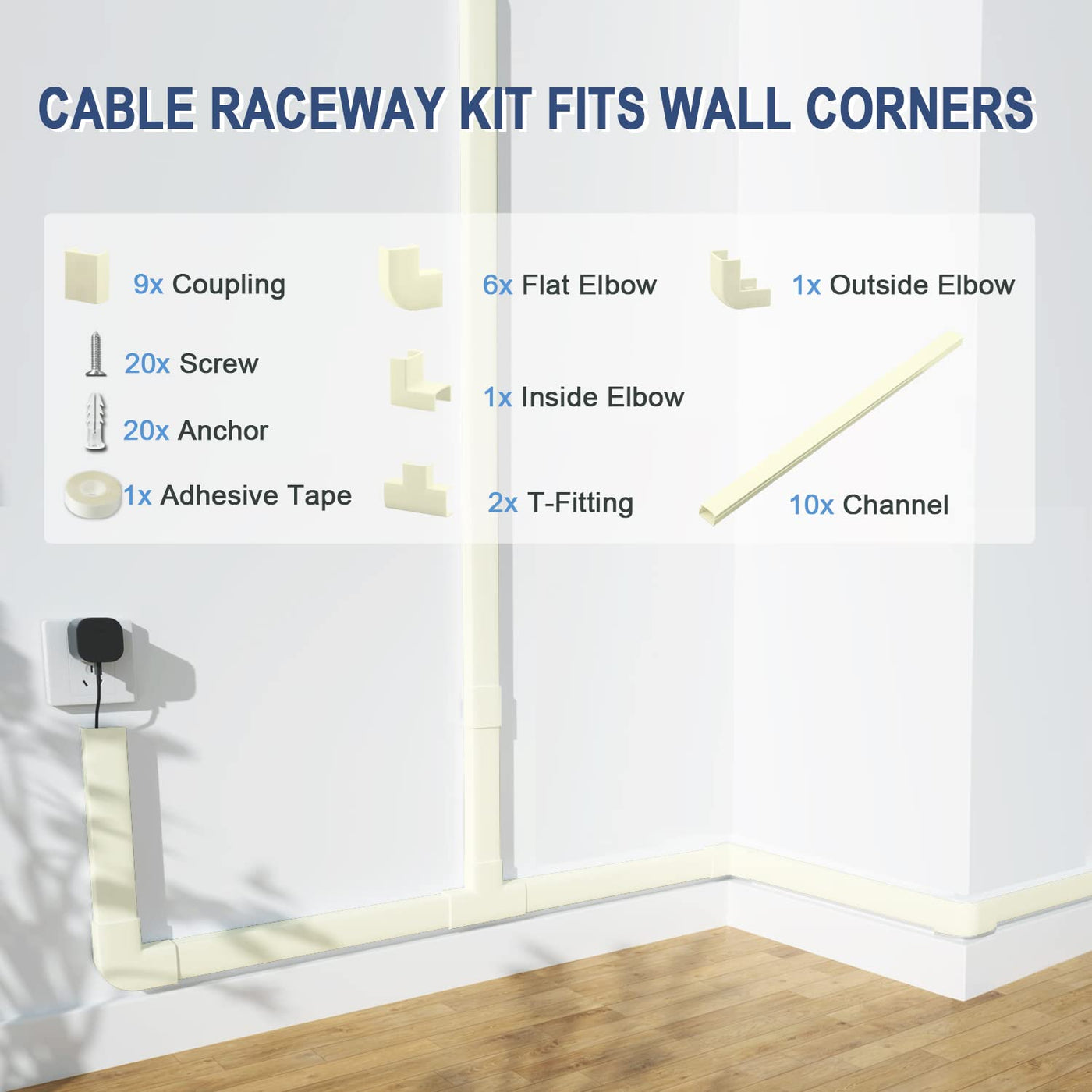 The Cord Cover Raceway Kit Offers A Solution For Hiding And Organizing Messy Cables, Resulting In A Neat And Tidy Appearance For Your Home Or Office. It Serves As A Universal Cable Management Solution That Can Be Used In A Variety Of Settings, Including Homes And Offices. Package: 10 Cable Cover Channels, 9 Couplings, 6 Flat Elbows, 1 Inside Elbow, 1 Outside Elbow, 2 T-Fittings, 20 Screws, 20 Anchors, And 1 Adhesive Tape. Size: L15.7Inch X W0.95Inch X H0.55Inch(10Pcs)