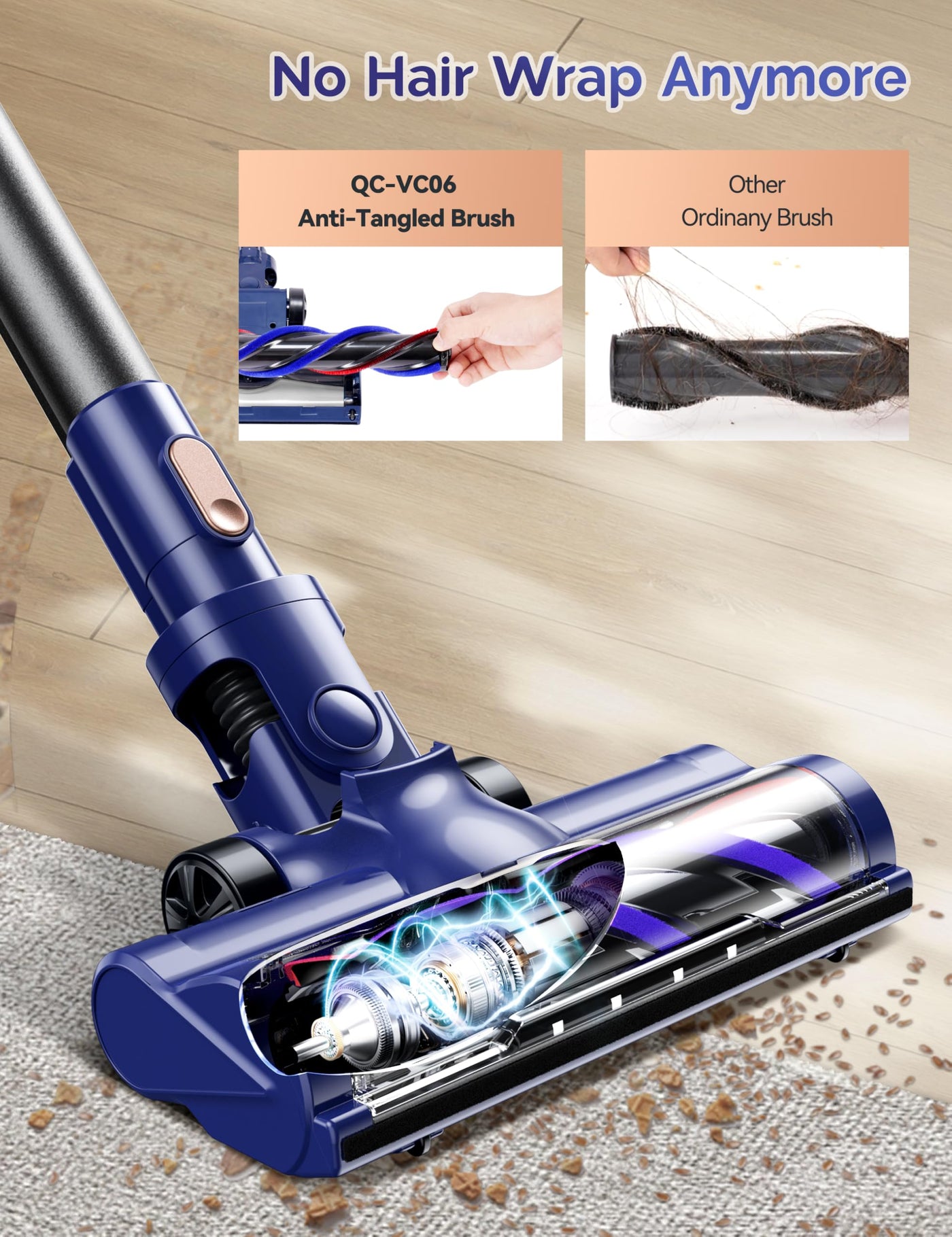 Q: What makes the floor brush of this vacuum unique?A: The upgraded floor brush features wider anti-tangle rollers that reduce hair tangles, LED headlights for illuminating dark corners, and it can lay flat at 180° for easy cleaning under furniture.