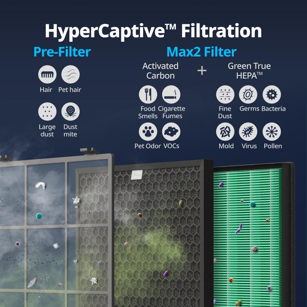 Q: How does the Coway Airmega 400 improve indoor air quality?A: The Coway Airmega 400 utilizes a HyperCaptive filtration system that combines a washable pre-filter, activated carbon filter, and Green True HEPA Filter to effectively capture 99.999% of 0.01-micron particles, including allergens and pollutants, ensuring cleaner air in your home.