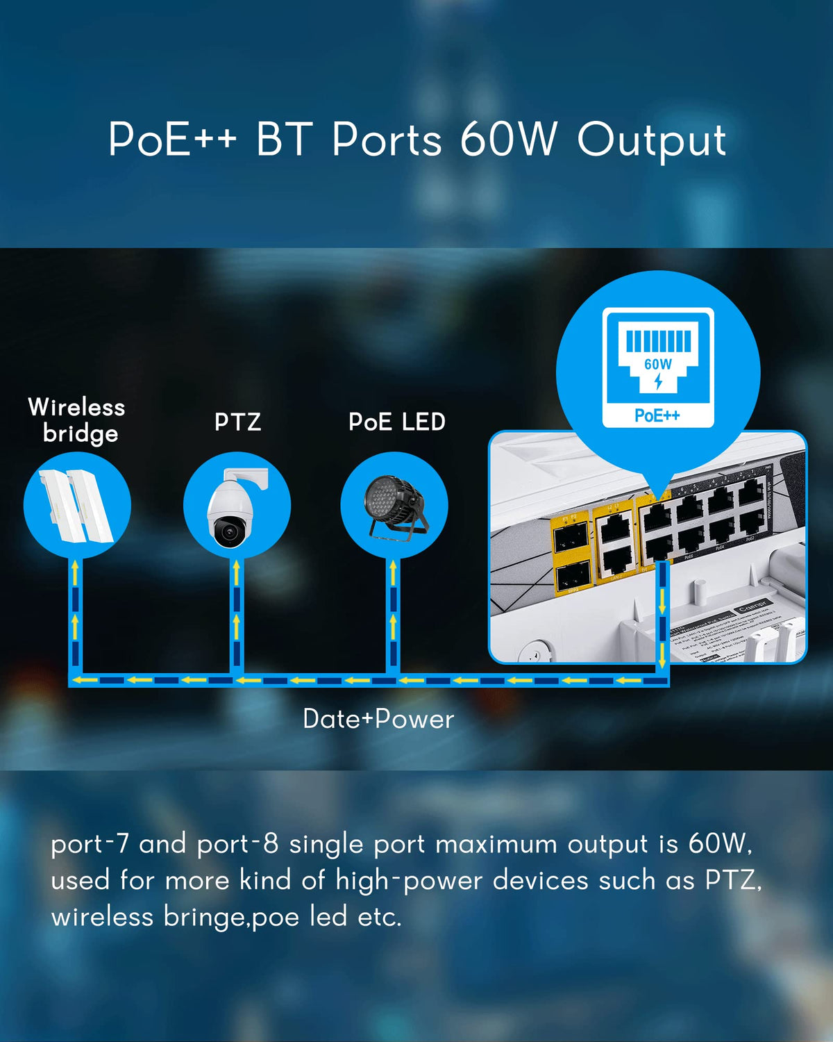 Cqenpr 12 Port Full Gigabit Outdoor Poe Switch, Ieee802.3Af/At/Bt, All In One Box, 60W Poe++, 120W High Power Output, Play & Plu