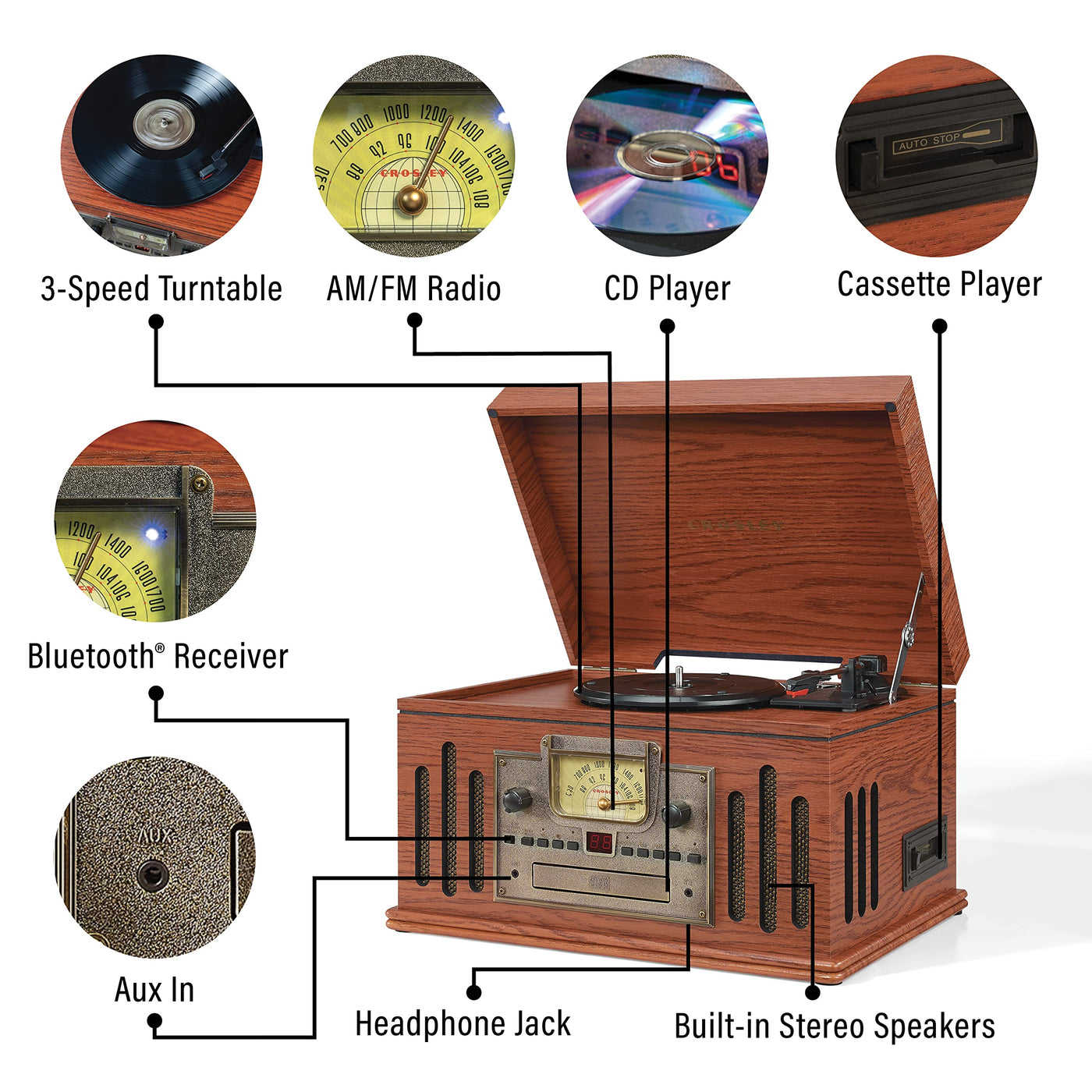 Give Analog Music The Encore It Deserves With The Crosley Musician 5-In-1 Turntable. This Hardwood Entertainment Center Offers More Than Just A Three-Speed Turntable. It'S Equipped With A Cd Player, Cassette Deck, And Even An Am/Fm Radio. There'S Also Built-In Bluetooth, Allowing You To Stream Your Favorite Music From Your Bluetooth-Enabled Device Wirelessly To The Full-Range Stereo Speakers. The Musician Marries Vintage Style With Modern Technology.