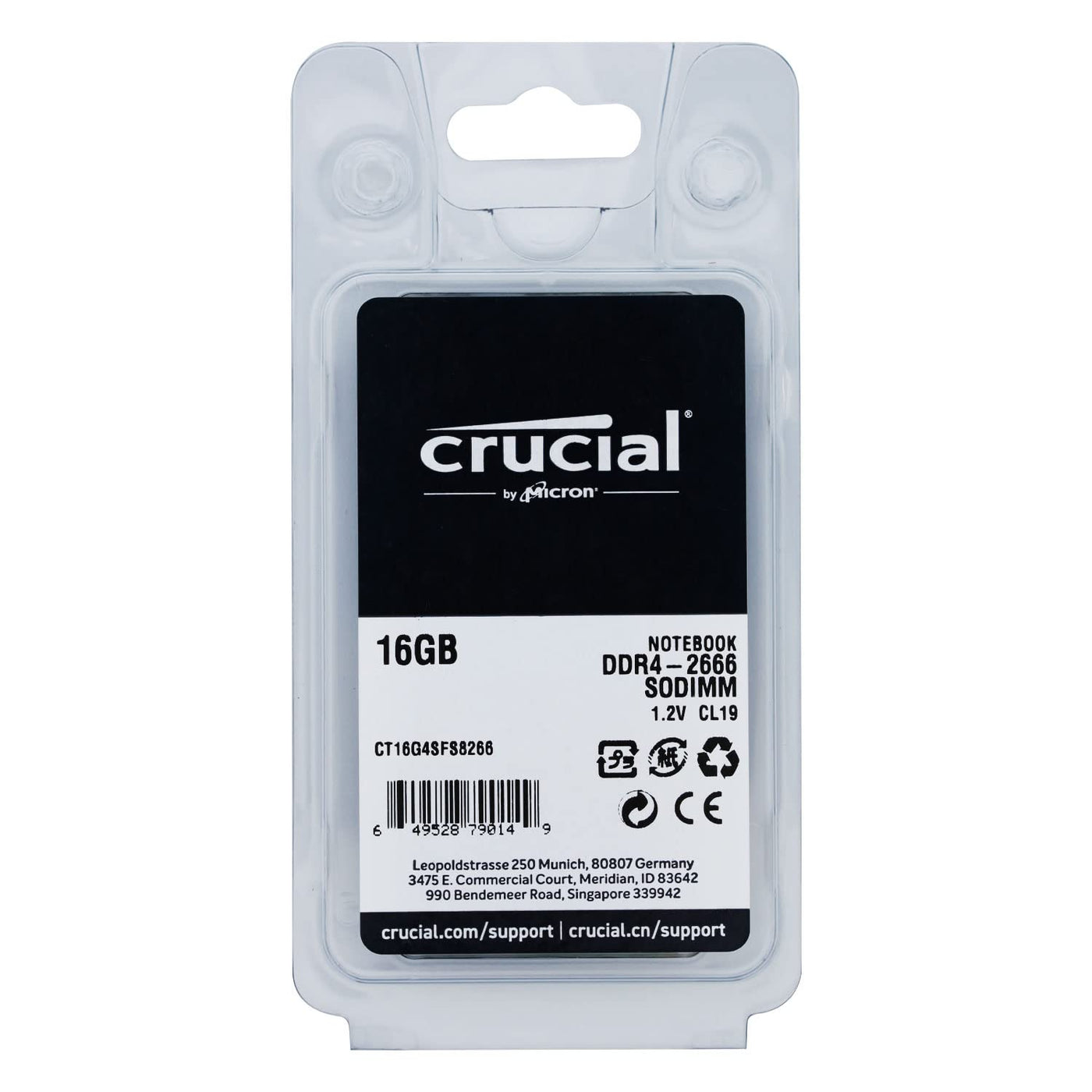 Manufacturer: Micron Technology, Inc. Manufacturer Part Number: Ct16G4Sfs8266. Brand Name: Crucial. Product Name: 16Gb Ddr4 Sdram Memory Module. Product Type: Ram Module. [Technical Information] Memory Size: 16 Gb. Memory Technology: Ddr4 Sdram. Memory Voltage: 1.20 V. Memory Speed: 2666 Mhz. Memory Standard: Ddr4-2666/Pc4-21300. Error Checking: Non-Ecc. Signal Processing: Unbuffered. Cas Latency: Cl19. Device Supported: Notebook. [Physical Characteristics] Number Of Pins: 260-Pin. Form Factor: Sodimm. Weight (Approximate): 3.53 Oz. [Miscellaneous] Environmentally Friendly: Yes. Environmental Certification: Weee. Rohs. China Rohs. Green Dot. Reach. Echa. Erp.