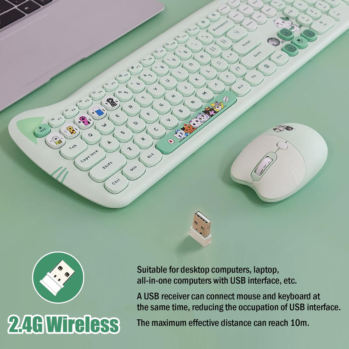 Cute Cat 2.4G Usb Wireless Keyboard And Mouse Combo, Silent Keys, Candy Colors, Compatible With Notebook, Pc (Green 110Keys)