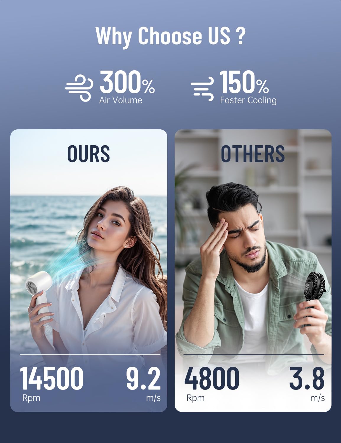 Q: What is the maximum wind speed of this handheld fan?A: This fan can reach a maximum wind speed of 9m/s, thanks to its high-speed three-phase brushless motor, providing powerful airflow for quick cooling.