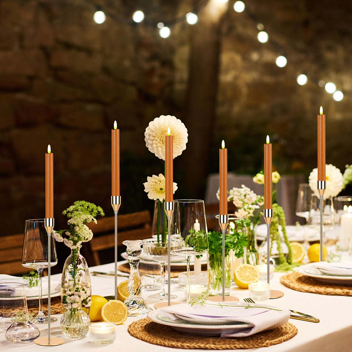 Q: What are the dimensions of the CVHOMEDECO flameless taper candles?A: The CVHOMEDECO flameless taper candles measure 0.78 inches in diameter and 10 inches in height, making them a perfect fit for most standard candle holders and decorative displays.