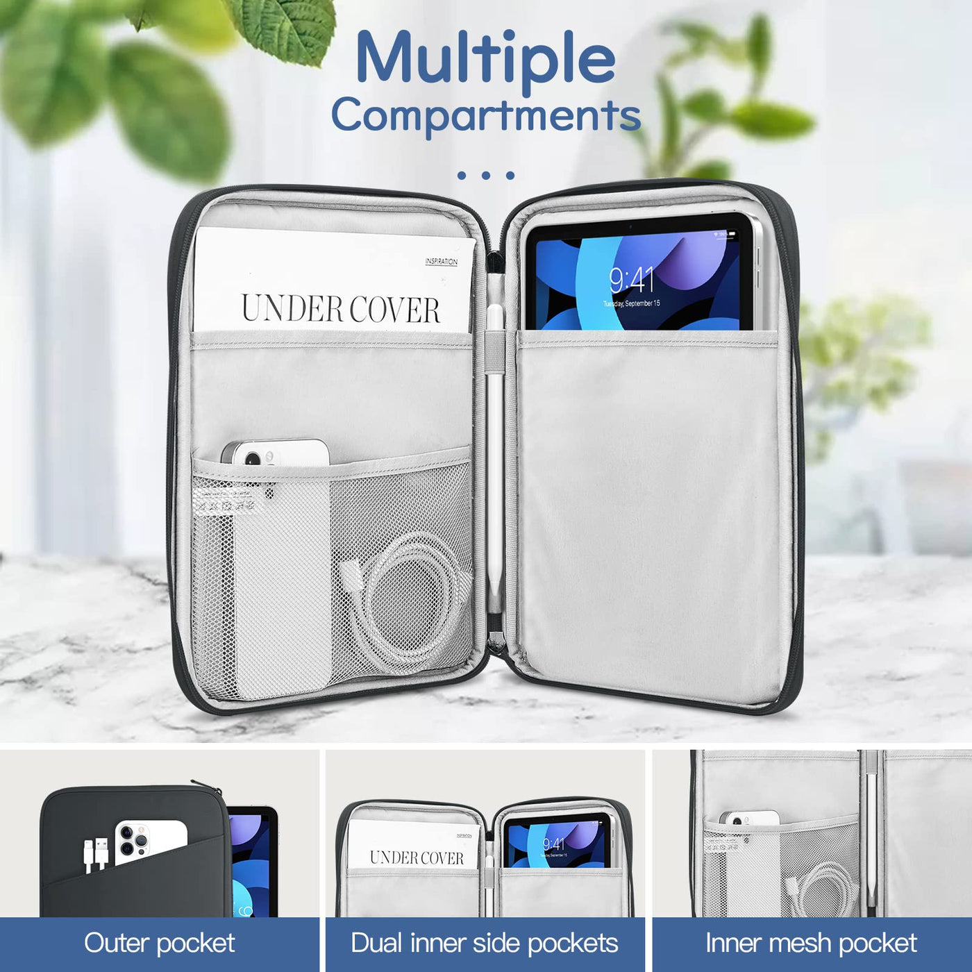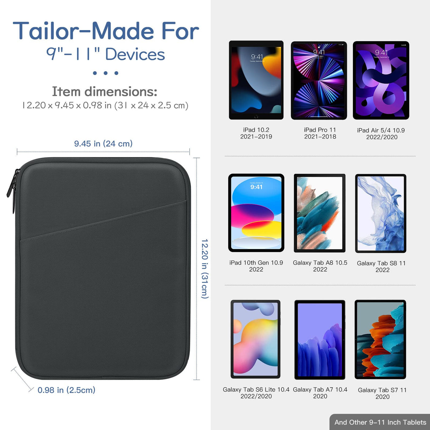 Dadanism Premium Sleeve Case Bag Fits 9-11 Inch Tablets - Simple But Meet Your Every Needs!Compatibility:Compatible With 9-11 Inch Tablets:Ipad Air 4 2020 (Ipad 10.9 Inch 2020)Ipad 10.2 Inch 2019 & 2020 (Ipad 7Th Generation & Ipad 8Th Generation)Ipad Pro 11 Inch (2Nd Gen 2020 Release /1St Gen 2018 Release)Ipad Air (3Rd Generation) 10.5 Inch 2019, Ipad Pro 10.5 Inchipad 9.7 6Th/5Th Generation, Ipad Air / Air 2, Ipad Pro 9.7 Inchsurface Go 10 Inch 2018 Release, Surface Go 2 10.5 Inch 2020Galaxy Tab S4 10.5 / Tab S3 9.7 Inch / Tab E 9.6 / Tab A 9.7 / Tab S2 9.7 / Tab A 10.1 / Tab 2 10.1 / Note 10.1, Etc.Safe & Portable:Smooth Zipper Closure For Best Security, Offers Your Tablet More Protection. Slim And Lightweight, Easy To Carry Around. It Can Easily Slide Into Your Briefcase, Backpack Or Other Bag.Organize Your Digital Life:There Are Multiple Compartments To Store Your Items. The Main Compartment Is For A Tablet. Outer Pocket Can Store Notepads, Documents, Etc. Dual Inner Side Pockets Are Suitable For Storing Ipad, Power Bank, Chargers, Pens, Mouse, And So On. Inner Mesh Pocket Can Store Earphones, Airpods, Cables, Etc.Full Protection And Superior Durability:It Is Made Of Premium Anti-Splash Polyester Exterior, Soft Lining And Padding, Durable. Protect Your Device From Scratches, Dents, Bumps And Shocks.Package Include:1 X Sleeve Bag