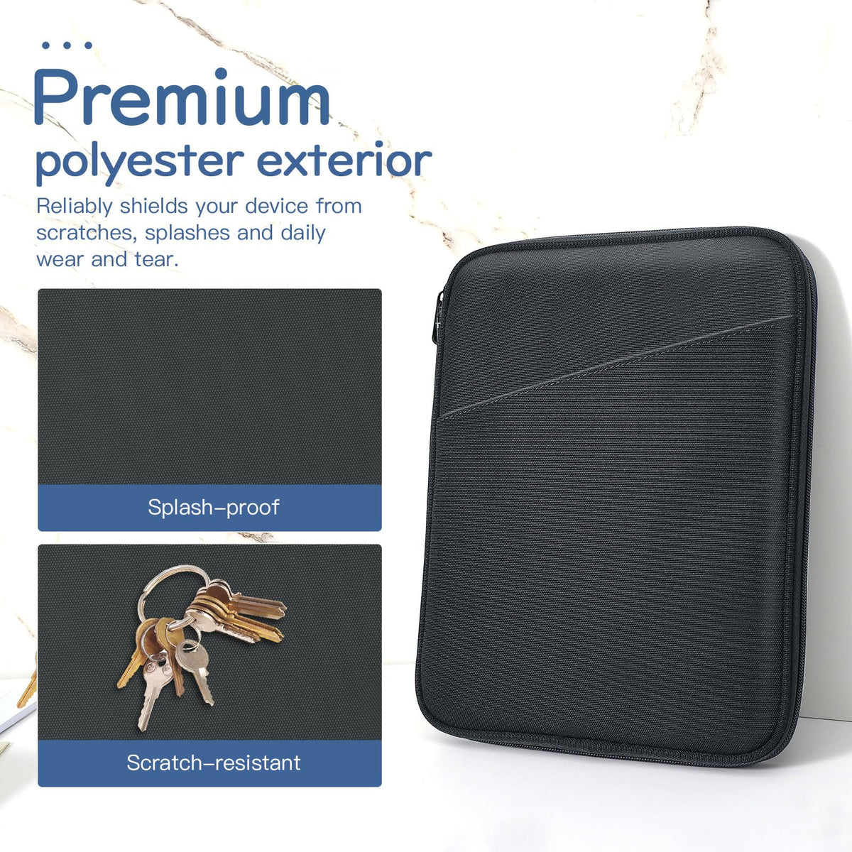 Q: How does the Dadanism Tablet Sleeve provide protection for my device?A: This tablet sleeve is constructed from premium anti-splash polyester with soft lining and padding, offering full protection against dust, scratches, dents, and shocks. The smooth zipper closure ensures additional security for your device.