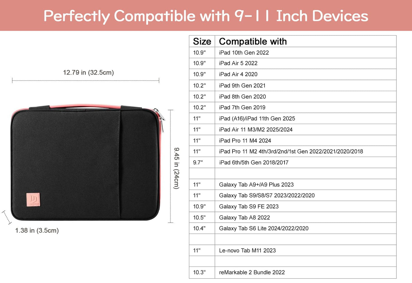 Dadanism Premium Sleeve Case Bag Fits 9-11 In Tablets - Simple But Meet Your Every Needs!Compatibility:Compatible With 9-11 Inch Tablets:Ipad Air 5 2022Ipad Air 4 2020 (Ipad 10.9 Inch 2020)Ipad 10.2 Inch 2019 2020 (Ipad 7Th Generation Ipad 8Th Generation)Ipad Pro 11 Inch (2Nd Gen 2020 Release 1St Gen 2018 Release) Ipad Air (3Rd Generation) 10.5 Inch 2019, Ipad Pro 10.5 Inch Ipad 9.7 6Th 5Th Generation, Ipad Air Air 2, Ipad Pro 9.7 Inch Surface Go 10 Inch 2018 Release, Surface Go 2 10.5 Inch 2020Galaxy Tab S4 10.5 Tab S3 9.7 Inch Tab E 9.6 Tab A 9.7 Tab S2 9.7 Tab A 10.1 Tab 2 10.1 Note 10.1, Etc.Safe Portable:Smooth Zipper Closure For Best Security, Offers Your Tablet More Protection. Slim And Lightweight, Easy To Carry Around. It Can Easily Slide Into Your Briefcase, Backpack Or Other Bag.Organize Your Digital Life:There Are Multiple Compartments To Store Your Items. The Main Compartment Is For A Tablet. Outer Pocket Can Store Notepads, Documents, Etc. Dual Inner Side Pockets Are Suitable For Storing Ipad, Power Bank, Chargers, Pens, Mouse, And So On. Inner Mesh Pocket Can Store Earphones, Airpods, Cables, Etc.Full Protection And Superior Durability:It Is Made Of Premium Anti-Splash Polyester Exterior, Soft Lining And Padding, Durable. Protect Your Device From Scratches, Dents, Bumps And Shocks.Package Include:1 X Sleeve Bag