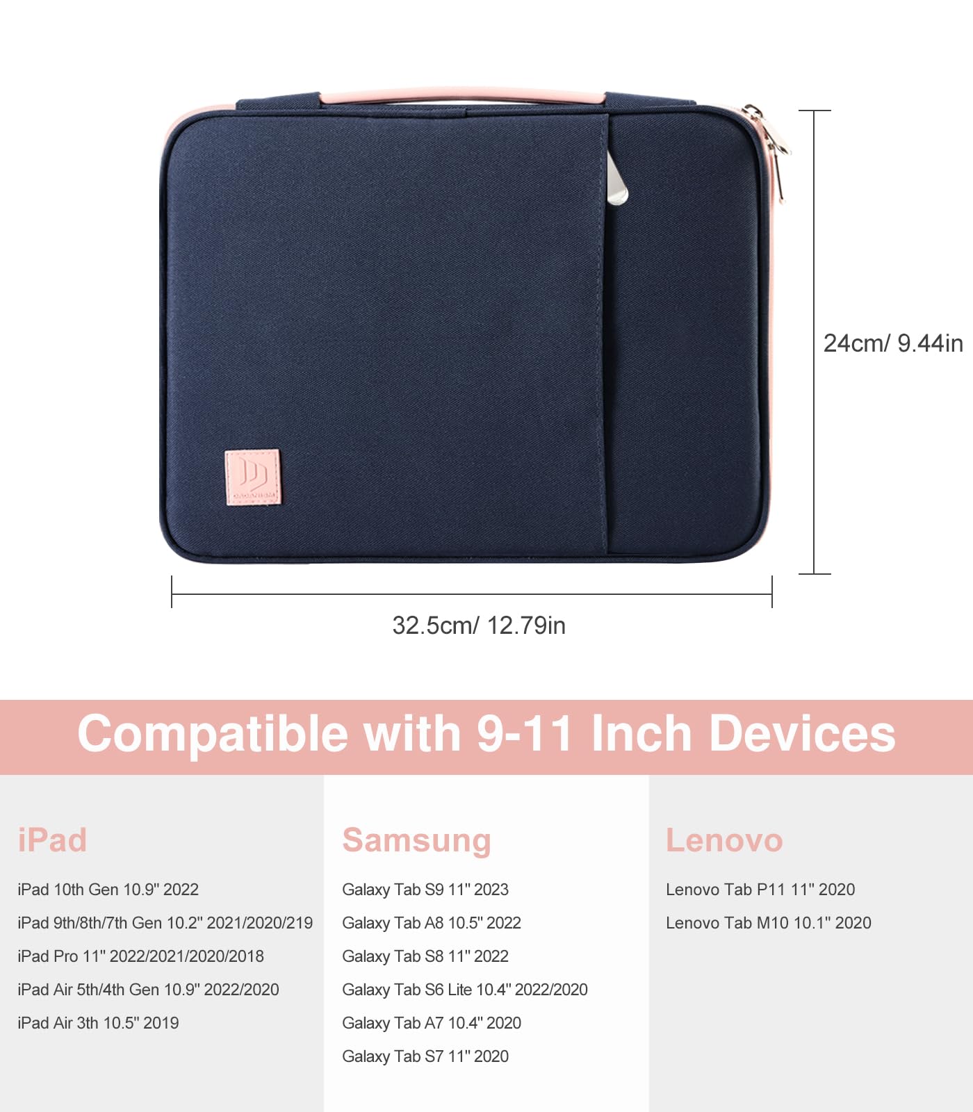 Dadanism Premium Sleeve Case Bag Fits 9-11 In Tablets - Simple But Meet Your Every Needs!Compatibility:Compatible With 9-11 Inch Tablets:Ipad Air 5 2022Ipad Air 4 2020 (Ipad 10.9 Inch 2020)Ipad 10.2 Inch 2019 & 2020 (Ipad 7Th Generation & Ipad 8Th Generation)Ipad Pro 11 Inch (2Nd Gen 2020 Release /1St Gen 2018 Release) Ipad Air (3Rd Generation) 10.5 Inch 2019, Ipad Pro 10.5 Inch Ipad 9.7 6Th/5Th Generation, Ipad Air / Air 2, Ipad Pro 9.7 Inch Surface Go 10 Inch 2018 Release, Surface Go 2 10.5 Inch 2020Galaxy Tab S4 10.5 / Tab S3 9.7 Inch / Tab E 9.6 / Tab A 9.7 / Tab S2 9.7 / Tab A 10.1 / Tab 2 10.1 / Note 10.1, Etc.Safe & Portable:Smooth Zipper Closure For Best Security, Offers Your Tablet More Protection. Slim And Lightweight, Easy To Carry Around. It Can Easily Slide Into Your Briefcase, Backpack Or Other Bag.Organize Your Digital Life:There Are Multiple Compartments To Store Your Items. The Main Compartment Is For A Tablet. Outer Pocket Can Store Notepads, Documents, Etc. Dual Inner Side Pockets Are Suitable For Storing Ipad, Power Bank, Chargers, Pens, Mouse, And So On. Inner Mesh Pocket Can Store Earphones, Airpods, Cables, Etc.Full Protection And Superior Durability:It Is Made Of Premium Anti-Splash Polyester Exterior, Soft Lining And Padding, Durable. Protect Your Device From Scratches, Dents, Bumps And Shocks.Package Include:1 X Sleeve Bag