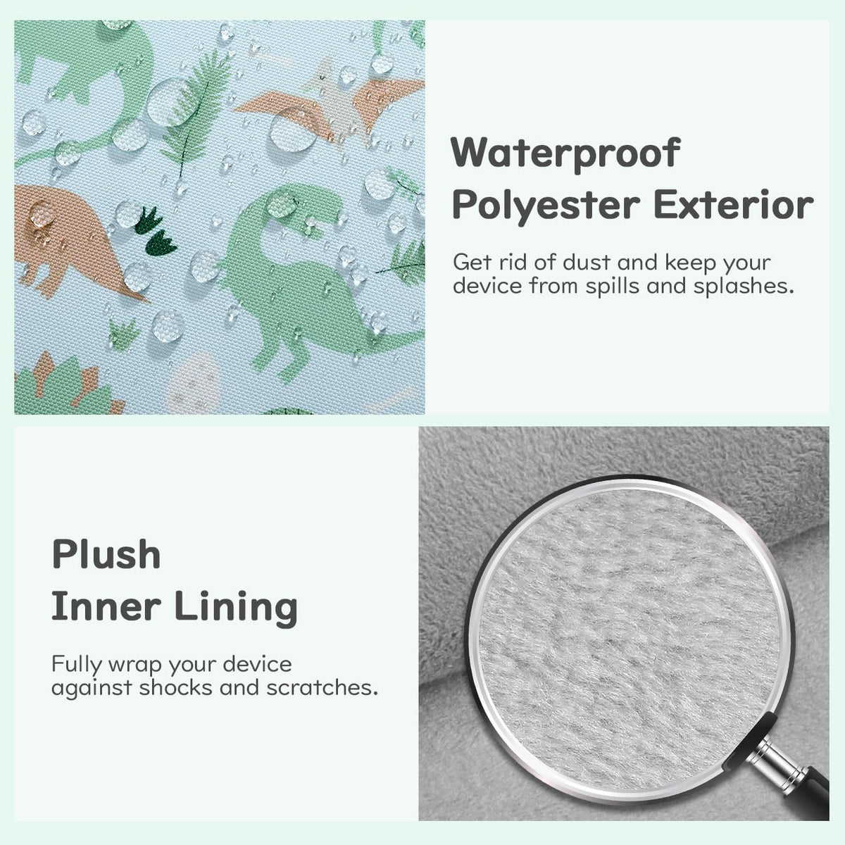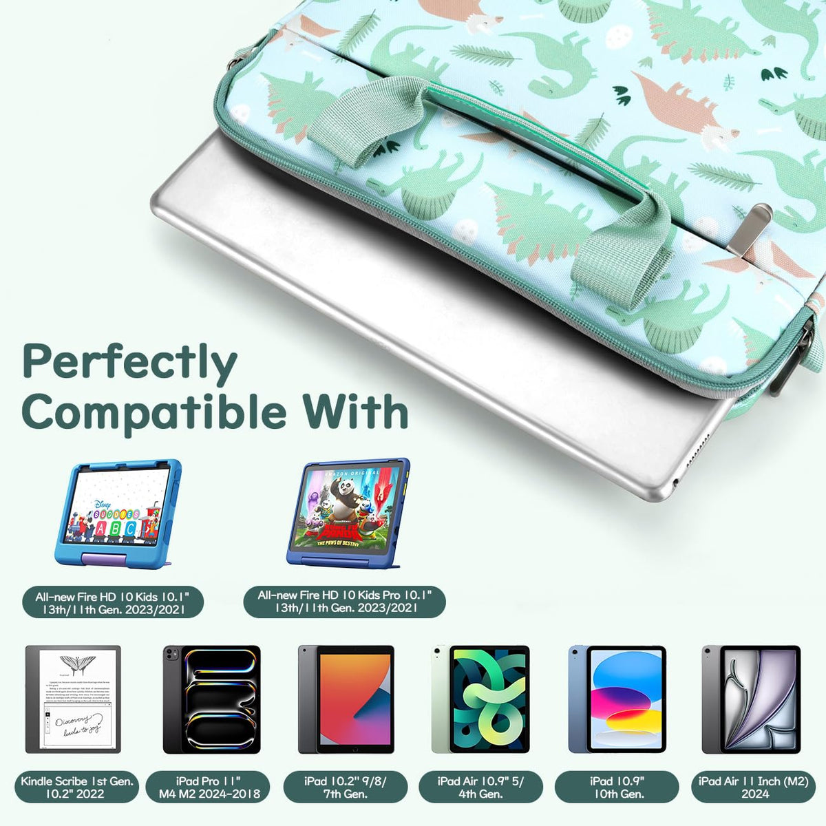 Dadanism Tablet Bag For Kidscompatibility: The Tablet Sleeve Bag Works With All-New Fire Hd 10 Kids 10.1'' 13Th/11Th Gen. 2023/2021, All-New Fire Hd 10 Kids Pro 10.1'' 13Th/11Th Gen. 2023/2021, Kindle Scribe 1St Gen. 2022 Released 10.2'', Ipad Pro 11'' M2 4Th/3Rd/2Nd/1St Gen., Ipad 10.2 9/8/7Th Gen., Ipad Air 5/4 10.9'', Ipad 10Th Gen. 10.9''.Capacity: The Main Pocket Perfectly Fits Your 12.5'' Devices. The External Pocket With Zipper Closure Is Designed For Your Mouse, Adapter, Usb, Etc.High-Quality Material: The Kids Briefcase For Boys Has Anti-Cushion Padding, And The Interior Is A Very Soft Fabric To Prevent Scratches. The Polyester Surface Is Well Protected Against Dust And Spills.Cute Style & Pattern: The Two-Sided Dinosaur Patterns Are Super Cute And Funny. Everything Is Well Made. Your Boys And Girls Will Be Very Pleased With The Tablet Bag.Portable Design: The Sturdy Handles And Adjustable Shoulder Strap Are Designed For Easy And Comfortable Carrying.Product Size: Length: 12.6In (32Cm)Width: 9.84In (25Cm)Height: 1.18In (3Cm)