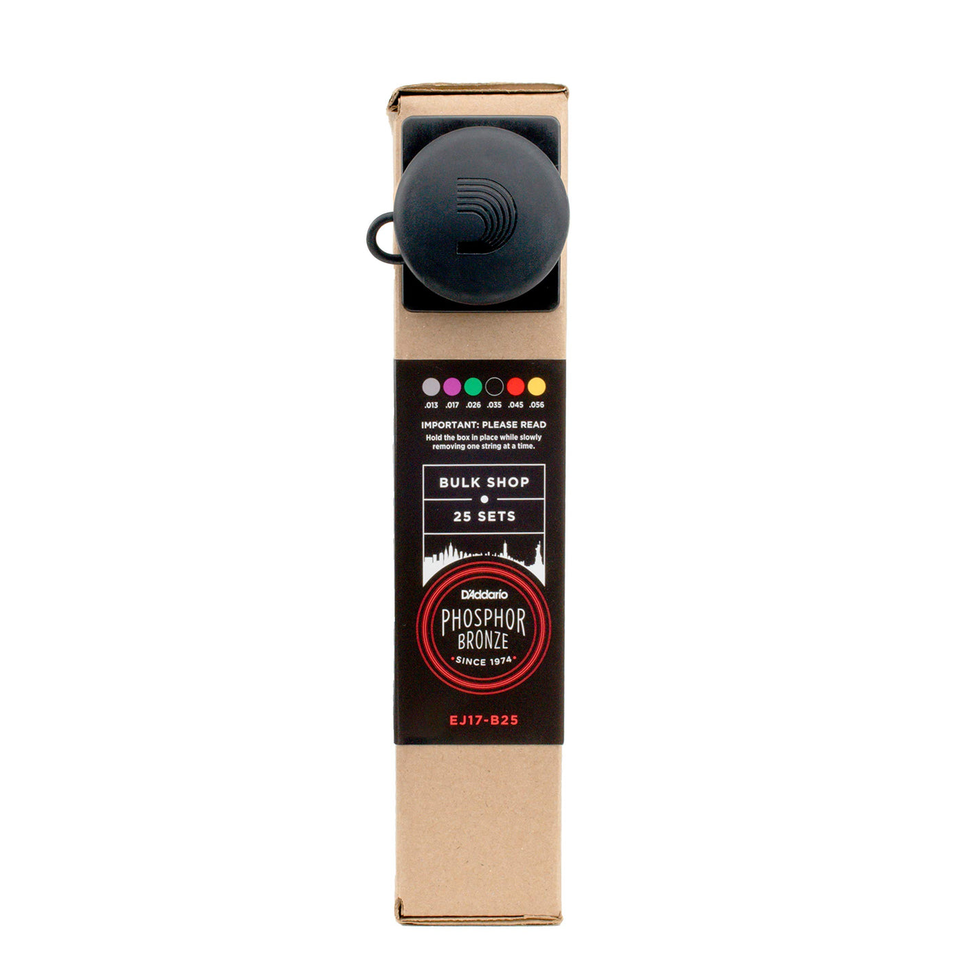 Product Descriptiondaddario Was The First To Use Phosphor Bronze In Acoustic Guitar Strings Back In 1974. Today, Phosphor Bronze Is Played Throughout The World And Considered To Be The Standard In Acoustic Strings, Thanks To Its Beautiful Sonic Balance And Tonal Warmth. Our Pioneering Phosphor Bronze Acoustic Guitar Strings Are Precision Wound With Phosphor Bronze Wrap Wire Over A High-Carbon Steel Core, Providing Tonal Versatility Suitable For All Acoustic Styles And Musical Genres. 13-56 Medium Gauge Strings Provides Maximum Volume And Projection, With More Tension And Resistance.From The Manufacturerej17S Offer Heavier Tension Resulting In A Bolder, More Resonant Acoustic Tone With Higher Resistance For Heavy Strumming And Flat-Picking. Containing 25 Sets Of Bulk Packaged Strings, The Ej17-B25 Bulk Shop Is Ideal For Guitarists With Multiple Guitars Or Anyone That Demands The Freshest Strings At A Great Value.Phosphor Bronze Was Introduced To String Making By Daddario In 1974 And Has Become Synonymous With Warm, Bright, And Well Balanced Acoustic Tone. Daddario Phosphor Bronze Strings Are Precision Wound With Corrosion Resistant Phosphor Bronze Onto A Carefully Drawn, Hexagonally Shaped, High Carbon Steel Core. The Result Is Long Lasting, Bright Sounding Tone With Excellent Intonation.Daddario, The Worlds Largest Manufacturer Of Musical Instrument Strings, Is Known As The Players Choice With A Reputation For Unsurpassed Quality And Consistency. Daddarios Innovative Packaging Reduces Waste And Provides Protection From Corrosion. All Daddario Strings Are Manufactured In The U.S.A. Using Proprietary, Digitally Controlled, State-Of-The-Art Machinery For Unmatched Performance, Set After Set.