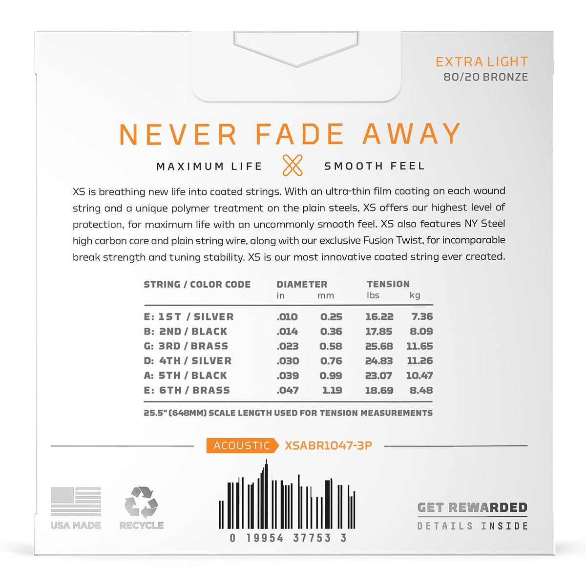 80/20 Bronze Are Our Brightest Acoustic Guitar Strings, Made To Give Your Tone An Unparalleled Shine. With The Addition Of Our Revolutionary Xs Coating, Our Bold, Bright 80/20 Strings Obtain Maximum Life, With An Uncommonly Smooth Feel. Made With A Ny Steel Core, 80/20 Bronze Wrap Wire, And Fusion Twist Technology, These Coated Acoustic Guitar Strings Have Enhanced Break Strength And Tuning Stability Over Standard 80/20S, In Addition To A Dramatically Increased Lifespan. These 10-47 Extra Light Gauge Xs Strings Are Easy To Play And Easy To Bend. Xs Is Breathing New Life Into Coated Strings. With Its Ultra-Thin Film Coating On Every Wound String And Unique Polymer Treatment On The Plain Steels, Xs Offers Our Highest Level Of Protection For Maximum Life With An Uncommonly Smooth Feel. Xs Also Features Ny Steel High Carbon Core And Plain String Wire, Along With Our Exclusive Fusion Twist, For Incomparable Break Strength And Tuning Stability. Xs Is The Most Innovative Coated String Ever Created.