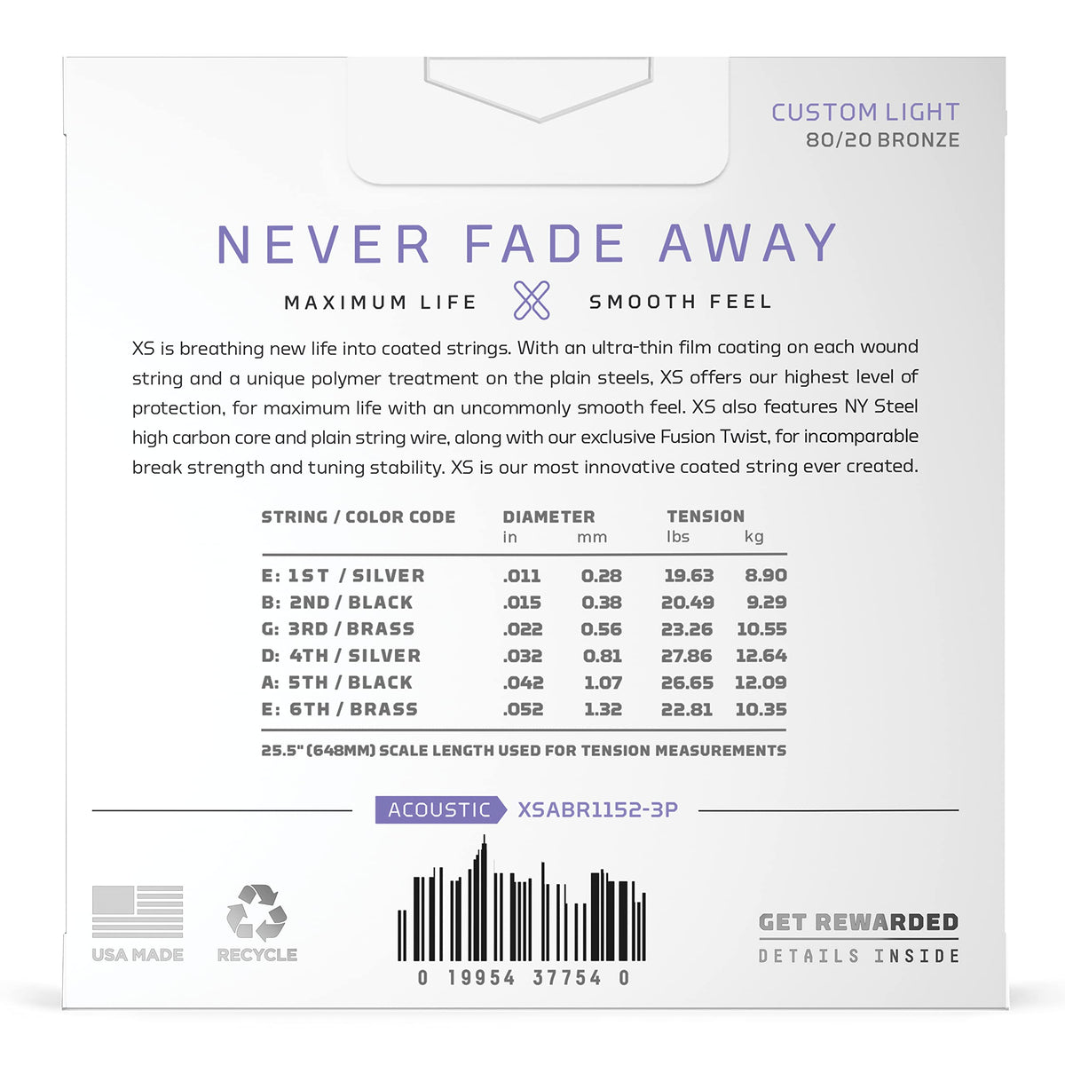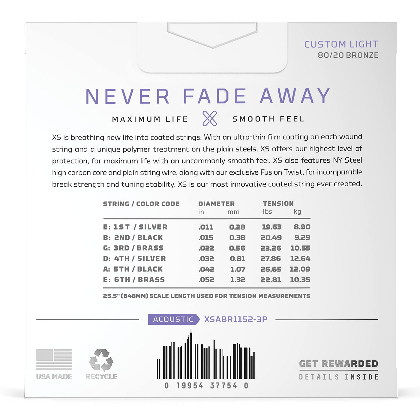 80/20 Bronze Are Our Brightest Acoustic Guitar Strings, Made To Give Your Tone An Unparalleled Shine. With The Addition Of Our Revolutionary Xs Coating, Our Bold, Bright 80/20 Strings Obtain Maximum Life, With An Uncommonly Smooth Feel. Made With A Ny Steel Core, 80/20 Bronze Wrap Wire, And Fusion Twist Technology, These Coated Acoustic Guitar Strings Have Enhanced Break Strength And Tuning Stability Over Standard 80/20S, In Addition To A Dramatically Increased Lifespan. This 11-52 Custom Light Gauge Set Has Slightly More Volume And Projection Than Extra Light, While Still Being Easy To Play. Xs Is Breathing New Life Into Coated Strings. With Its Ultra-Thin Film Coating On Every Wound String And Unique Polymer Treatment On The Plain Steels, Xs Offers Our Highest Level Of Protection For Maximum Life With An Uncommonly Smooth Feel. Xs Also Features Ny Steel High Carbon Core And Plain String Wire, Along With Our Exclusive Fusion Twist, For Incomparable Break Strength And Tuning Stability. Xs Is The Most Innovative Coated String Ever Created.
