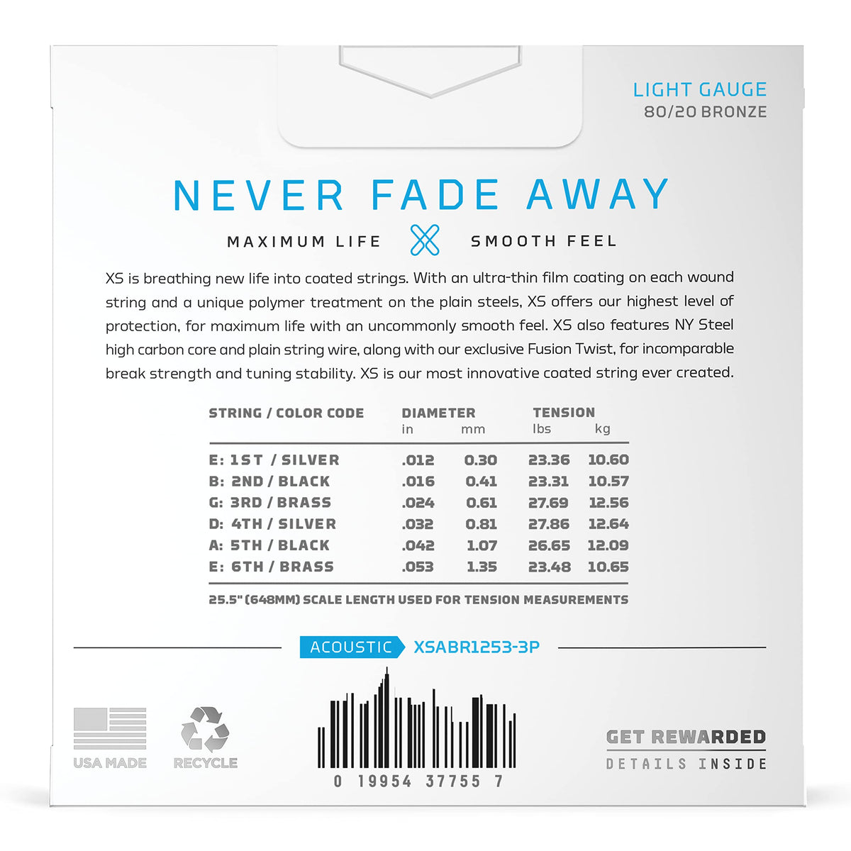 80/20 Bronze Are Our Brightest Acoustic Guitar Strings, Made To Give Your Tone An Unparalleled Shine. With The Addition Of Our Revolutionary Xs Coating, Our Bold, Bright 80/20 Strings Obtain Maximum Life, With An Uncommonly Smooth Feel. Made With A Ny Steel Core, 80/20 Bronze Wrap Wire, And Fusion Twist Technology, These Coated Acoustic Guitar Strings Have Enhanced Break Strength And Tuning Stability Over Standard 80/20S, In Addition To A Dramatically Increased Lifespan. 12-53 Light Strings Are Our Most Popular Acoustic Gauge, Providing A Nice Balance Of Playability And Tone. Xs Is Breathing New Life Into Coated Strings. With Its Ultra-Thin Film Coating On Every Wound String And Unique Polymer Treatment On The Plain Steels, Xs Offers Our Highest Level Of Protection For Maximum Life With An Uncommonly Smooth Feel. Xs Also Features Ny Steel High Carbon Core And Plain String Wire, Along With Our Exclusive Fusion Twist, For Incomparable Break Strength And Tuning Stability. Xs Is The Most Innovative Coated String Ever Created.