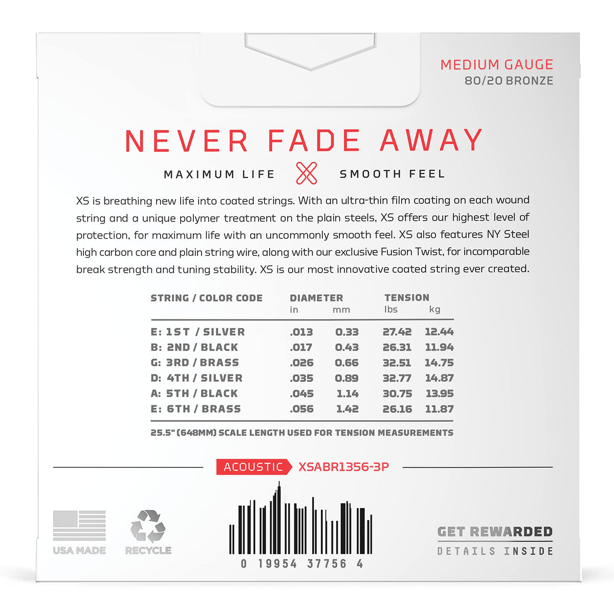 80/20 Bronze Are Our Brightest Acoustic Guitar Strings, Made To Give Your Tone An Unparalleled Shine. With The Addition Of Our Revolutionary Xs Coating, Our Bold, Bright 80/20 Strings Obtain Maximum Life, With An Uncommonly Smooth Feel. Made With A Ny Steel Core, 80/20 Bronze Wrap Wire, And Fusion Twist Technology, These Coated Acoustic Guitar Strings Have Enhanced Break Strength And Tuning Stability Over Standard 80/20S, In Addition To A Dramatically Increased Lifespan. This 13-56 Medium Gauge Set Provides Maximum Volume And Projection, With More Tension And Resistance. Xs Is Breathing New Life Into Coated Strings. With Its Ultra-Thin Film Coating On Every Wound String And Unique Polymer Treatment On The Plain Steels, Xs Offers Our Highest Level Of Protection For Maximum Life With An Uncommonly Smooth Feel. Xs Also Features Ny Steel High Carbon Core And Plain String Wire, Along With Our Exclusive Fusion Twist, For Incomparable Break Strength And Tuning Stability. Xs Is The Most Innovative Coated String Ever Created.