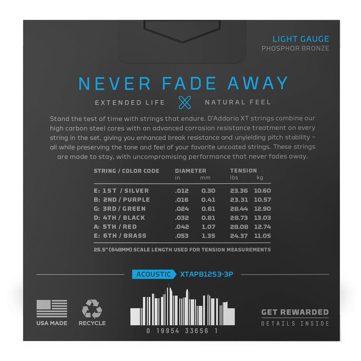 Since Daddario Introduced Phosphor Bronze Acoustic Guitar Strings In 1974, Theyve Been Synonymous With Warm, Well-Balanced Tone. Xt Phosphor Bronze Offers That And More, Boasting Enhanced Break Resistance, Better Pitch Stability, And Longer Life Than Our Standard Phosphor Bronze Strings. The Xt Coating Delivers Advanced Corrosion Resistance, While Still Retaining The Warm Tone And Natural Feel Of The Uncoated String. Beneath The Coating, These Xt Acoustic Strings Are Constructed With A Ny Steel Core, Phosphor Bronze Wrap Wire, And Fusion Twist Technology, Affording Tonal Versatility With Added Resilience, Excellent For A Wide Range Of Acoustic Styles.