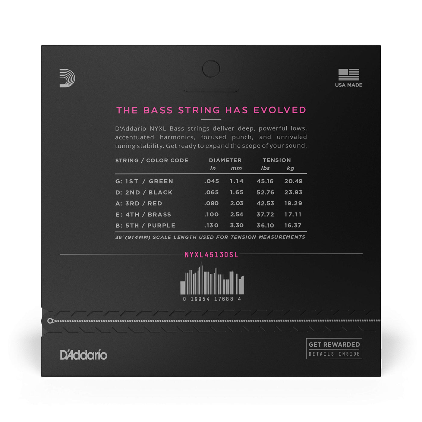Nyxl Bass Guitar Strings Thump Harder, Bend Farther, And Sound Thicker Than Any Bass String Youve Played Before. As Our Premium Uncoated Bass String, Nyxl Bass Strings Provide Higher Break Strength, Enhanced Tuning Stability, And Accentuated Harmonics Where It Counts. Using A Ny Steel Core, Fusion Twist Technology, And Premium Nickel-Plated Steel Wrap Wire, With A Reengineered Core-To-Wrap Ratio, Nyxl Bass Guitar Strings Deliver Extra Versatility, Familiar Feel, And A Boosted Tone Thatll Expand The Scope Of Your Low-End. Made For 5-String Basses, This 45-130 Regular Light Super Long Scale Set Provides Players With An Extremely Versatile, Super Long Scale String, In Our Most Popular String Gauge.
