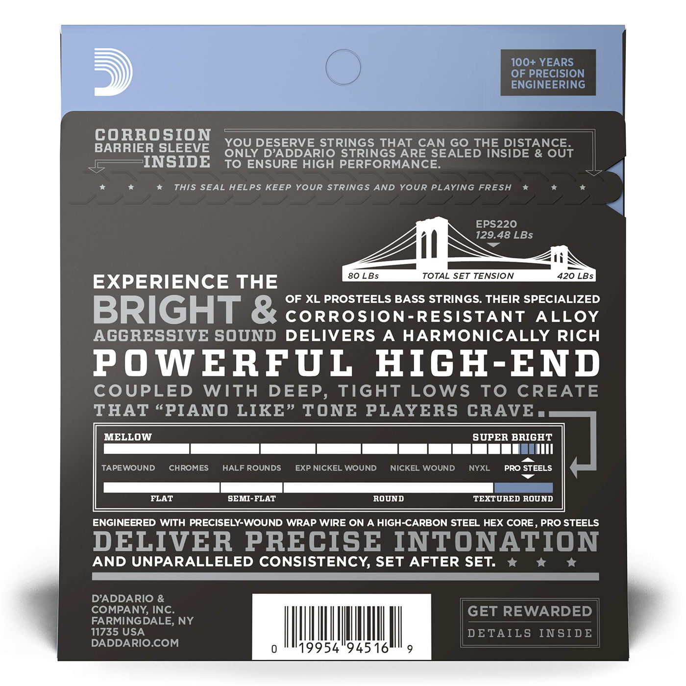 Product Descriptionxl Prosteels Are Daddarios Brightest Bass Guitar Strings. The Unique, Highly Magnetic Alloy In Prosteels Delivers Super-Bright Tone With Magnified Presence And Attack. Made With A High Carbon Steel Core And Stainless Steel Wrap Wire, Prosteels Produce Enhanced Interaction With Magnetic Pickups, Offering A Palette Of Harmonically Rich, Brilliantly Penetrating Highs, Combined With Pronounced, Tight-And-Tough Lows. These 40-95 Super Light Strings Have A Bright Attack And Very Light Tension, Making Them Easier To Play.From The Manufacturerdaddario Eps220 Offers More Playing Flexibility For Players Than A Standard Bass Set While Still Maintaining The Distinctive Combination Of Biting High End, Punchy Lows And Super Long Life. Fits Long Scale Basses With A String Scale Length Of Up To 36 1/4 Inches.Prosteels Are D'Addario'S Brightest And Most Magnetic Bass Strings. A Specialized Steel Alloy Delivers Harmonically Rich, Brilliant High-End Coupled With Deep, Tight Lows That Work In Tandem To Create The Coveted ''Piano Tone'' Steel Players Crave. Great For Both Articulate Fingering Or Aggressive Picking, Prosteels Give You The Extra Edge And Punch You Need To Cut Through The Mix.D'Addario, The World'S Largest Manufacturer Of Musical Instrument Strings, Is Known As The Players Choice With A Reputation For Unsurpassed Quality And Consistency. D'Addario'S Innovative Packaging Reduces Waste And Provides Protection From Corrosion. All D'Addario Strings Are Manufactured In The U.S.A. Using Proprietary, Digitally Controlled, State-Of-The-Art Machinery For Unmatched Performance, Set After Set.