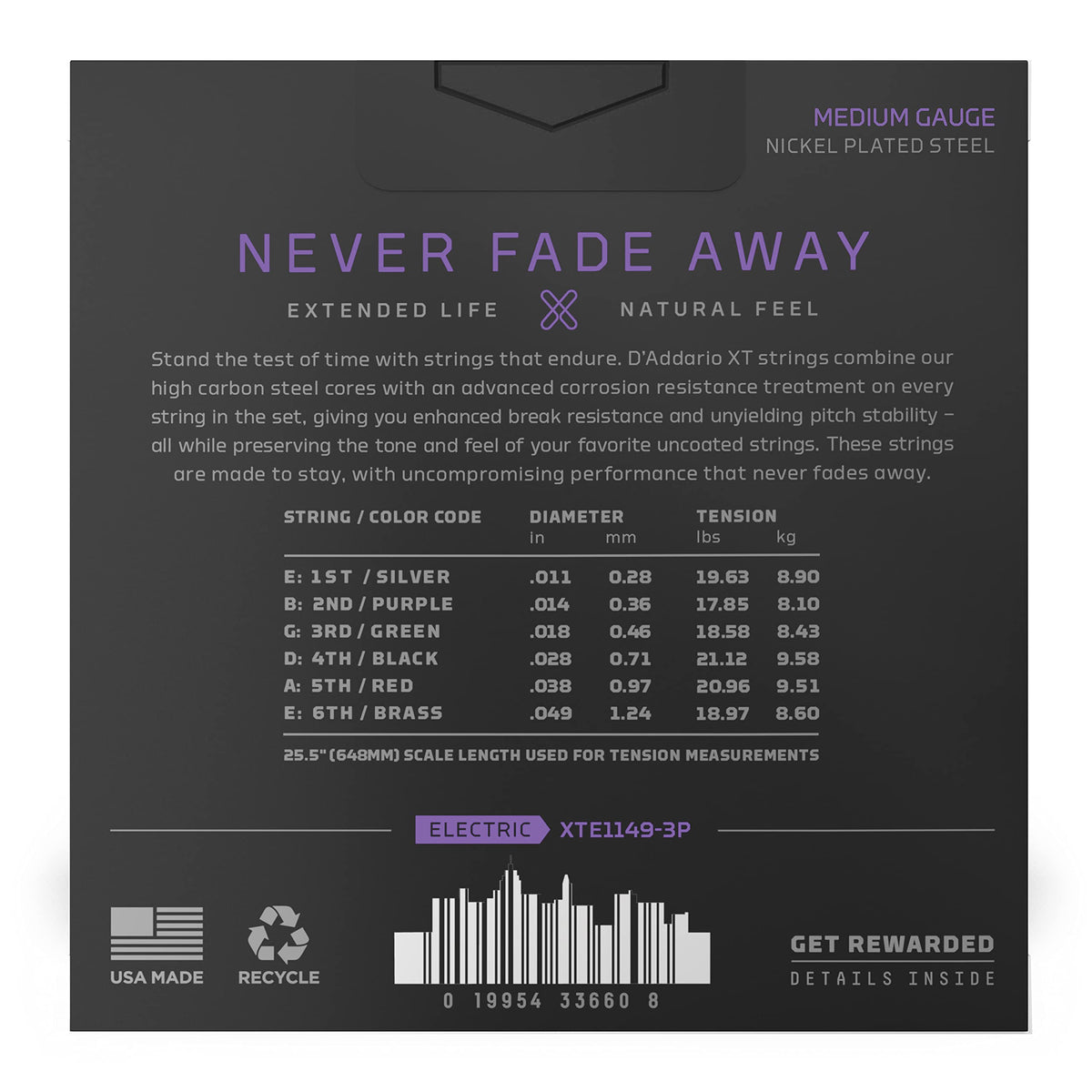 D'Addario Electric Guitar Strings, Xt Nickel Coated, Xte1149 3P, Medium Gauge 11 49, 6 String Set, Pack Of 3