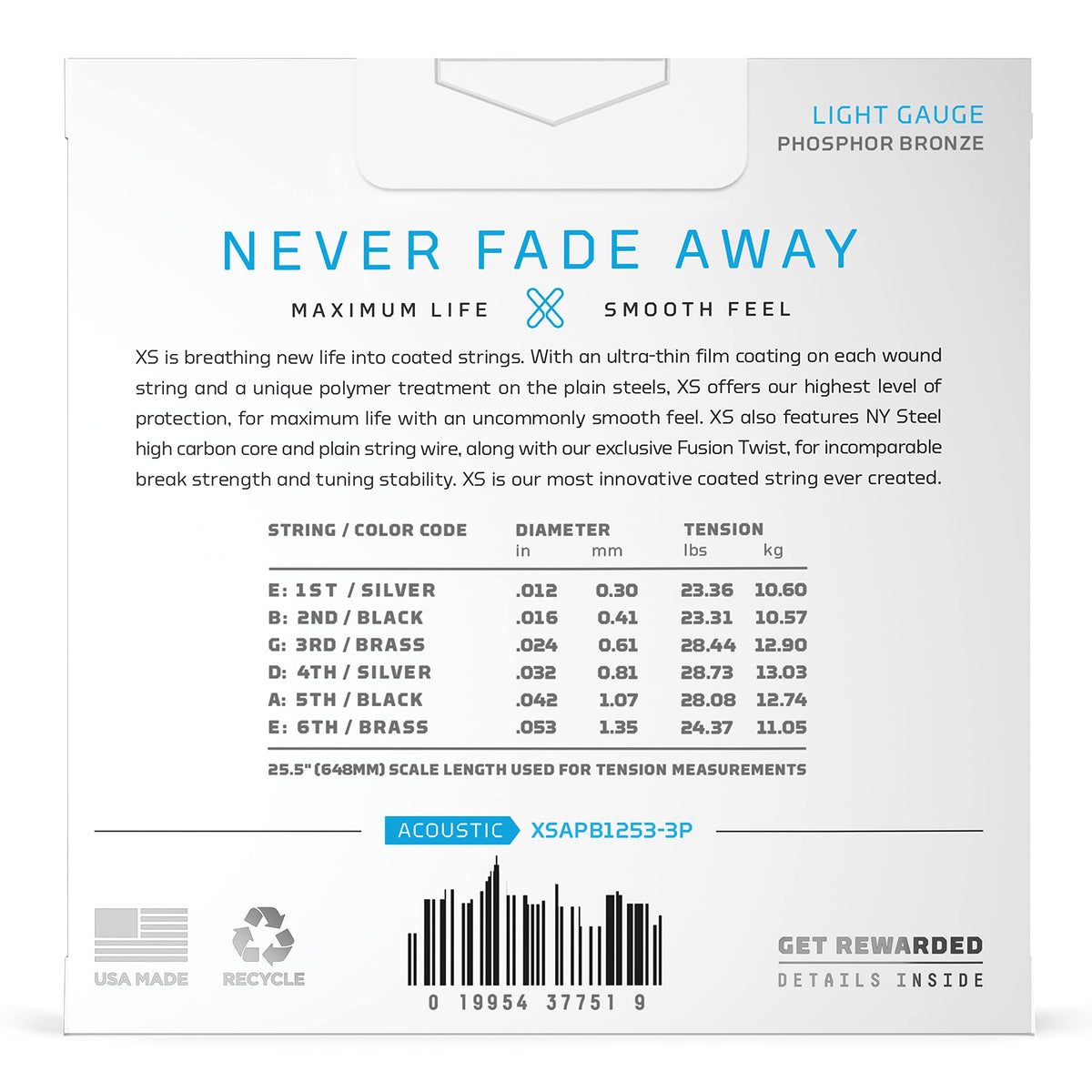 Born From Our Greatest Breakthrough In String Innovation, Xs Phosphor Bronze Strings Have The Longest Life Of Any Daddario Acoustic Guitar String. The Xs Coating Gives Our Warm, Balanced Phosphor Bronze Strings Maximum Life, With An Uncommonly Smooth Feel. Made With A Ny Steel Core, Phosphor Bronze Wrap Wire And Fusion Twist Technology, Xs Coated Acoustic Guitar Strings Have Incomparable Break Strength And Tuning Stability, In Addition To Their Dramatically Increased Lifespan. 12-53 Light Strings Are Our Most Popular Acoustic Gauge, Providing A Nice Balance Of Playability And Tone. Xs Is Breathing New Life Into Coated Strings. With Its Ultra-Thin Film Coating On Every Wound String And Unique Polymer Treatment On The Plain Steels, Xs Offers Our Highest Level Of Protection For Maximum Life With An Uncommonly Smooth Feel. Xs Also Features Ny Steel High Carbon Core And Plain String Wire, Along With Our Exclusive Fusion Twist, For Incomparable Break Strength And Tuning Stability. Xs Is The Most Innovative Coated String Ever Created.