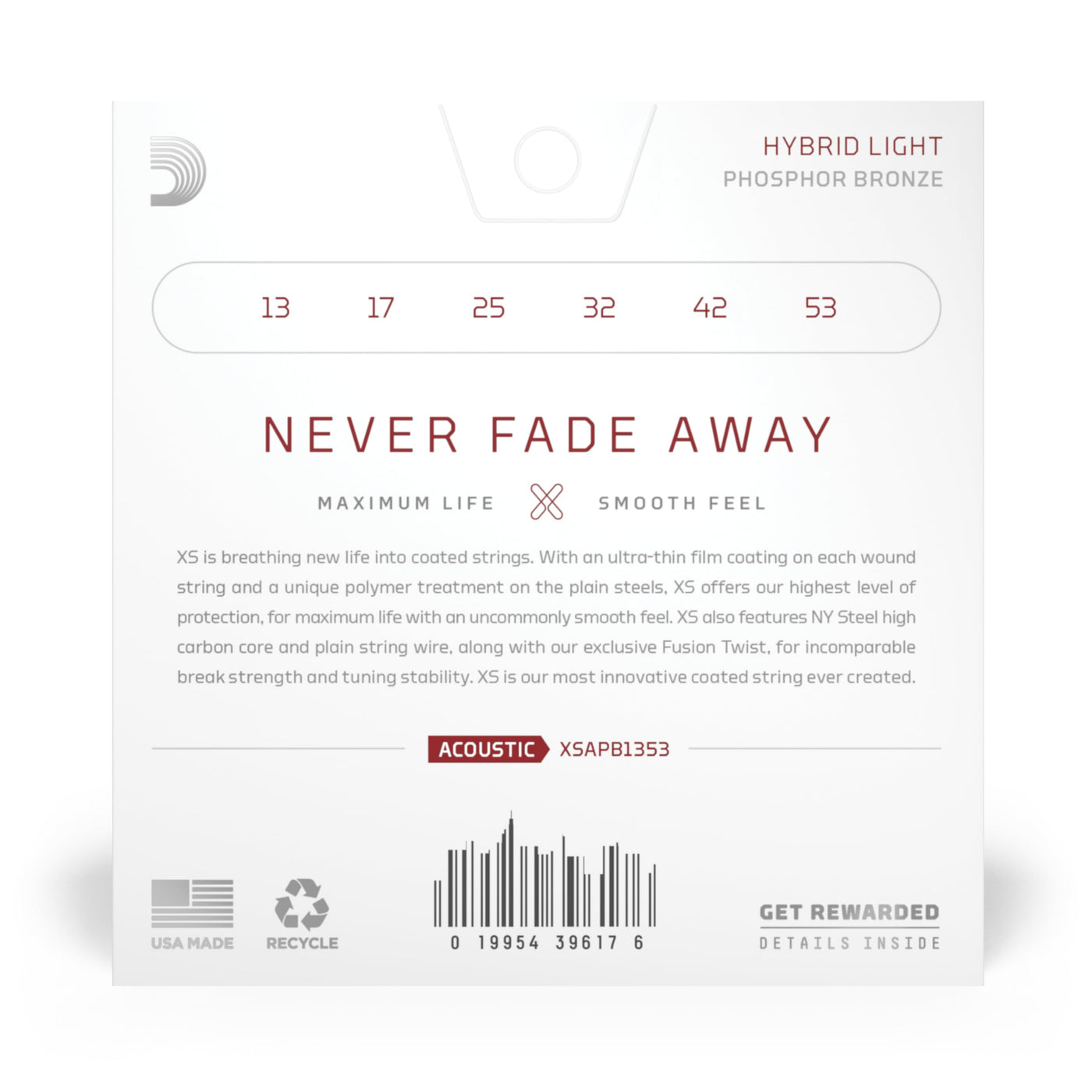 Born From Our Greatest Breakthrough In String Innovation, Xs Phosphor Bronze Strings Have The Longest Life Of Any Daddario Acoustic Guitar String. The Xs Coating Gives Our Warm, Balanced Phosphor Bronze Strings Maximum Life, With An Uncommonly Smooth Feel. Made With A Ny Steel Core, Phosphor Bronze Wrap Wire And Fusion Twist Technology, Xs Coated Acoustic Guitar Strings Have Incomparable Break Strength And Tuning Stability, In Addition To Their Dramatically Increased Lifespan. 13 - 53 Hybrid Light Is A Unique Combination Of Light And Medium Gauges, Using Light Tension Strings On The Bottom And Medium On Top For Added Projection.