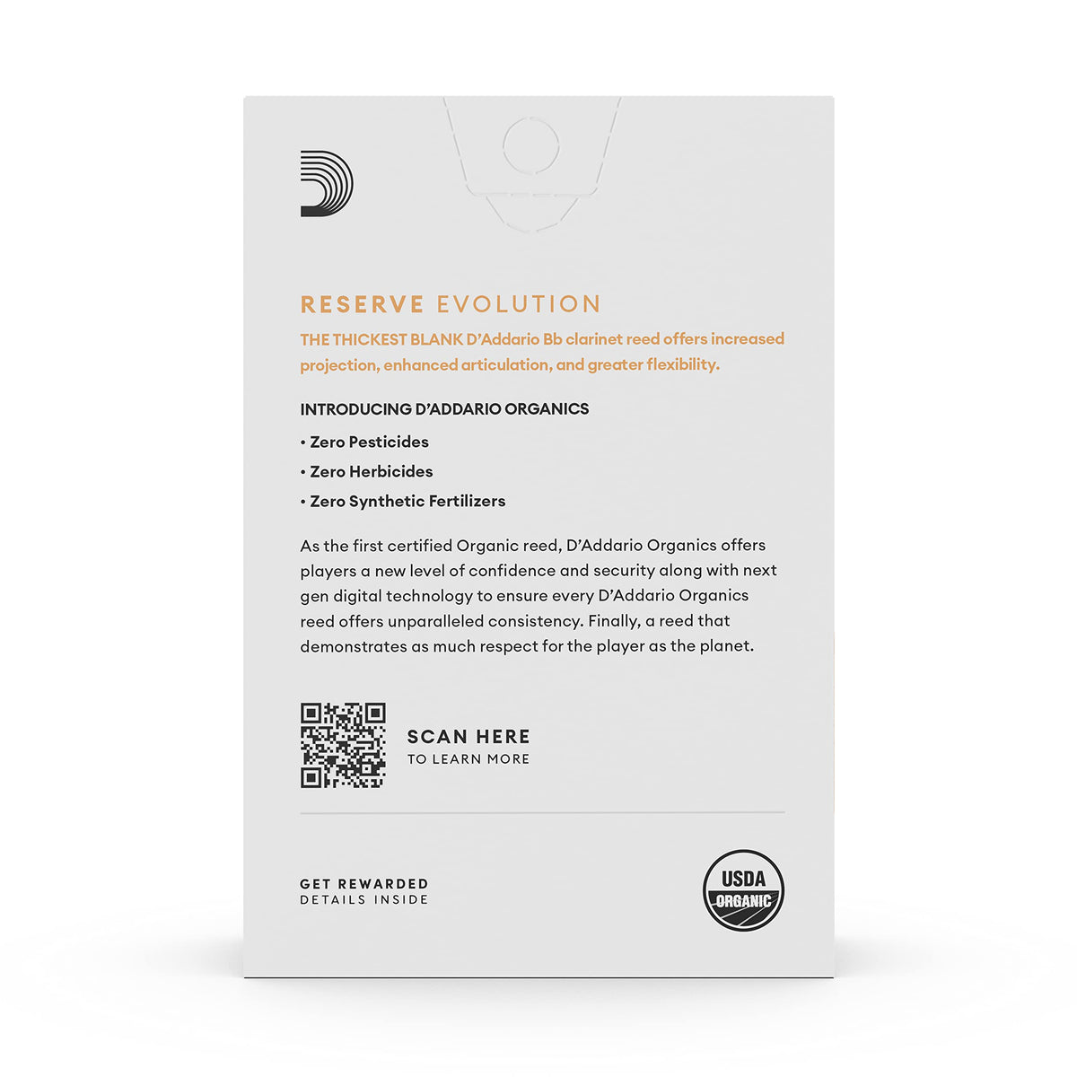 As The First Certified Organic Reed, Daddario Organics Offers Players A New Level Of Confidence And Security Along With Next Gen Digital Technology To Ensure Every D'Addario Organics Reed Offers Unparalleled Consistency. Organic Reserve Evolution Features The Thickest Blank Of The Reserve Clarinet Line. It Offers A Round Sound, A Heavy Spine For Increased Projection, A Thicker Tip For Enhanced Articulation, And Greater Tonal Warmth And Flexibility. Each Reed In The Pack Comes Individually-Sealed In A Recyclable Paper Reed Holder And Flow Wrap.