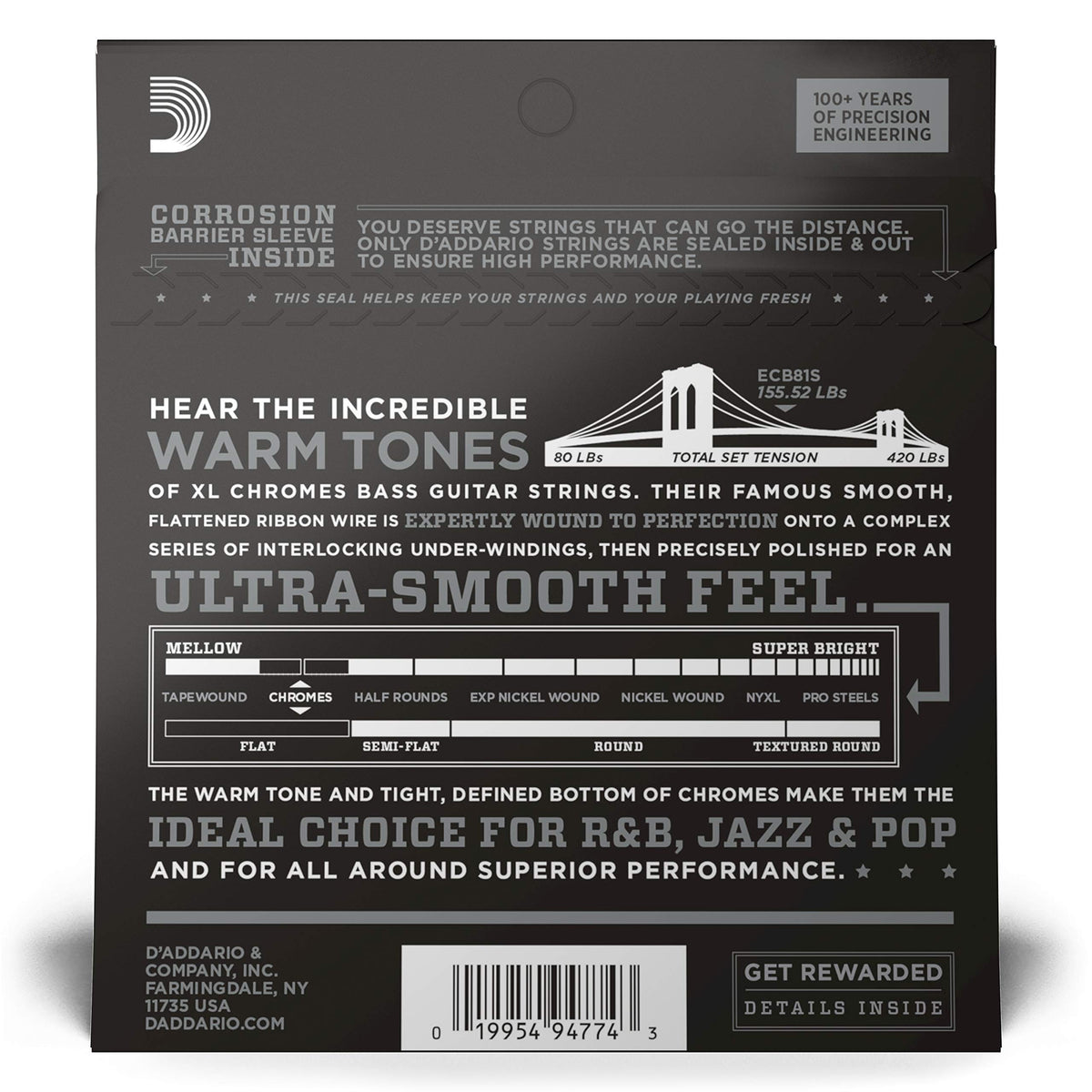 Product Descriptionxl Chromes Are Among The Warmest, Mellowest Bass Strings We Have To Offer. These Flat Wound Strings Provide An Ultra-Smooth Feel And A Dark, Yet Warm Tone, While Allowing Movement Across The Fretboard With No Finger Noise. Made With A High Carbon Steel Core, Chromes Stainless Steel Flattened Ribbon Wrap Wire Is Expertly Wound Onto A Series Of Interlocking Under-Windings, Then Precisely Polished For Unparalleled Smoothness And A Tonal Presence Which Blends Beautifully Into The Mix. This 45-100 Regular Light Set Is A Short Scale Version Of Our Best-Selling Bass Gauge, Known For Its Even Tension, Bright Tone, And Tight Low-End.From The Manufacturerecb81S, A Short Scale Version Of D'Addario'S Best-Selling Flatwound Bass Strings, Are Known For Their Warm, Mellow Tone And Smooth Polished Feel. Chromes Deliver A Deep, Rich Low Bottom End Which Makes Them The Flat Wound Choice Of Jazz, R&B And Pop Musicians. Fits Short Scale Basses With A String Scale Length Of Up To 32 Inches.D'Addario Chromes Bass Strings Are Wound With Flattened Stainless Steel Ribbon Wire Which Is Polished To An Incredibly Smooth Surface. Delivering A Distinctive Damped, But Tone-Rich Sound That Only Flatwounds Can Produce, D'Addario Chromes Are The World'S Most Popular Flatwound Strings.D'Addario, The World'S Largest Manufacturer Of Musical Instrument Strings, Is Known As The Players Choice With A Reputation For Unsurpassed Quality And Consistency. D'Addario'S Innovative Packaging Reduces Waste And Provides Protection From Corrosion. All D'Addario Strings Are Manufactured In The U.S.A. Using Proprietary, Digitally Controlled, State-Of-The-Art Machinery For Unmatched Performance, Set After Set.