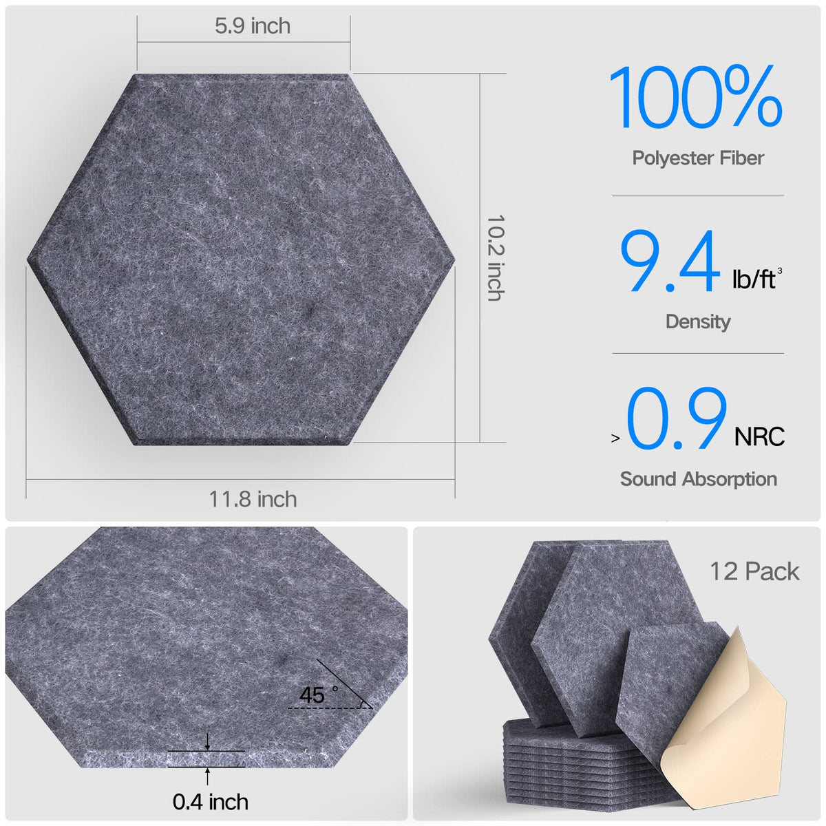 Dailycooper 12 Pack Self Adhesive Acoustic Panels 12'' X 10'' X 0.4'' Sound Proof Foam Panels With High Density, Stylish Hexag