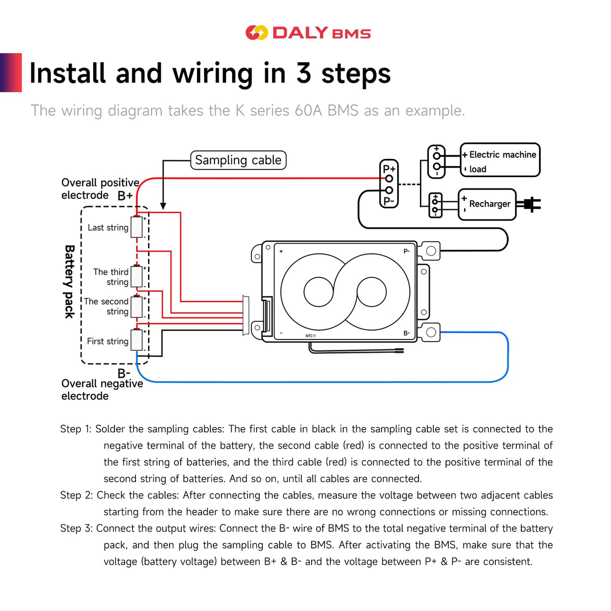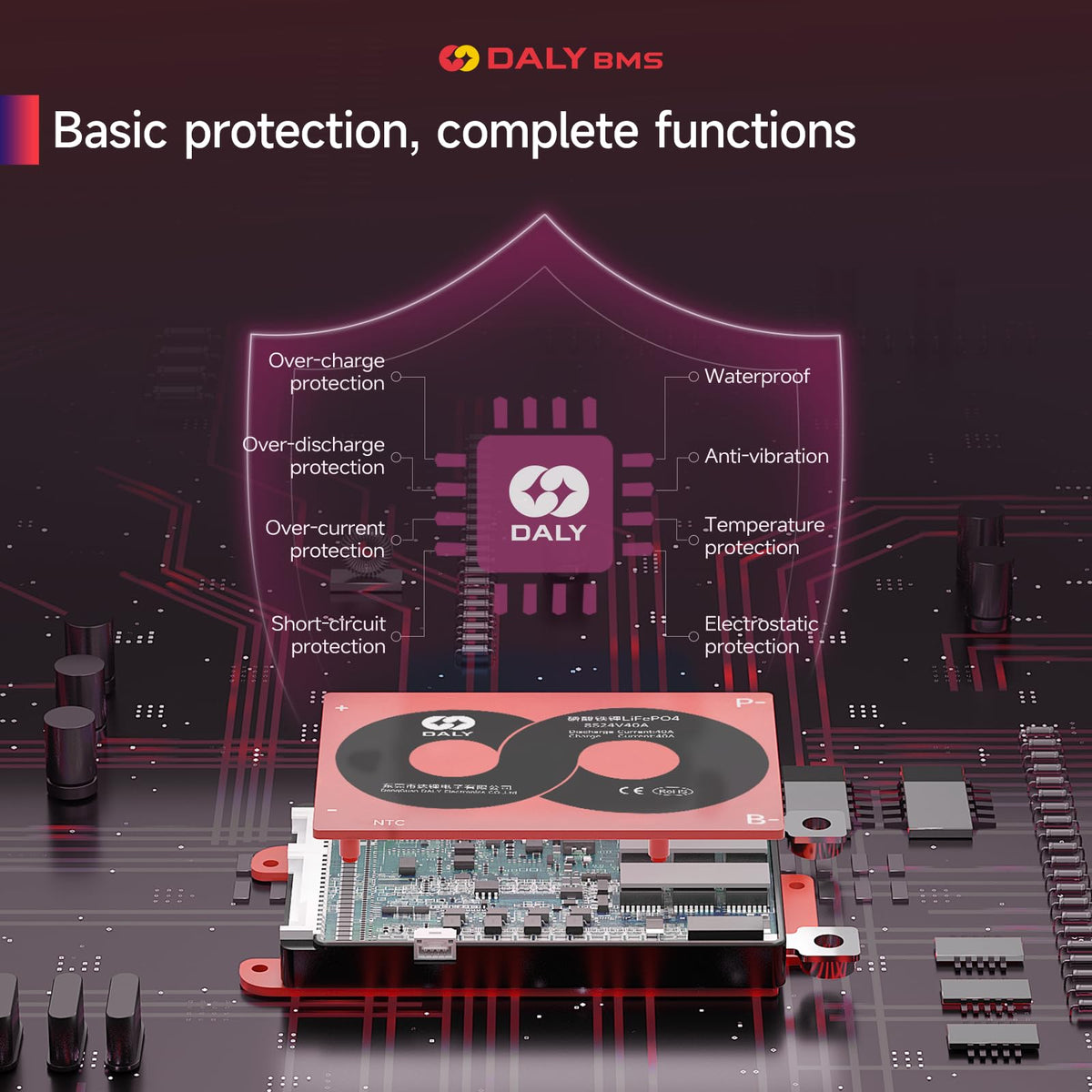 Q: Does the DALY BMS provide protection features?A: Yes, the DALY BMS offers multiple protection features such as over-charging, over-discharging, over-current, temperature monitoring, and short-circuit protection to safeguard your battery.