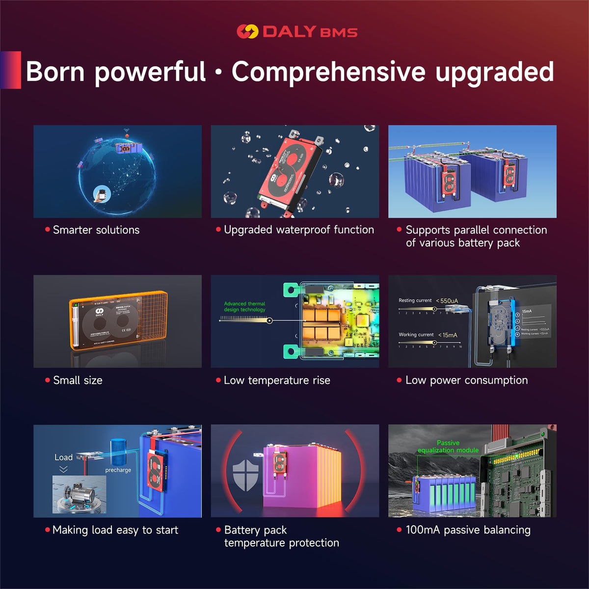 Q: What types of protection does the DALY Smart BMS offer?A: This BMS provides multiple protection features, including overcharge protection, overdischarge protection, overcurrent protection, short circuit protection, temperature protection, and waterproof protection.