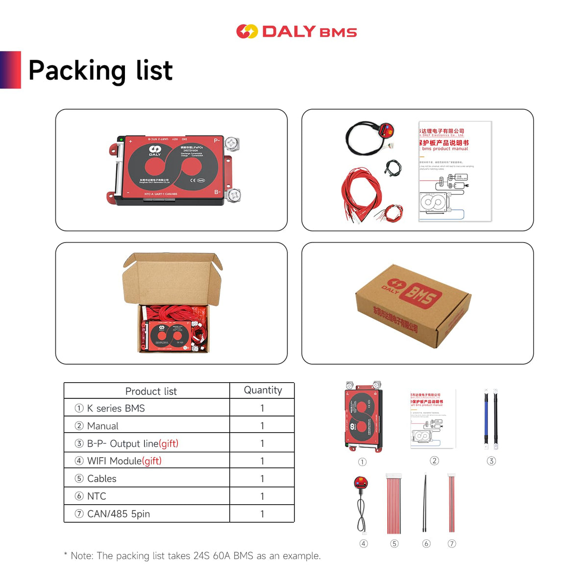 Q: What accessories come with the DALY Smart BMS 8S 24V 60A?A: The DALY Smart BMS 8S 24V 60A comes with essential accessories for installation and operation, tailored for optimal performance of the battery management system. Specific accessory details can vary, so it's recommended to check the packaging or product guidelines.
