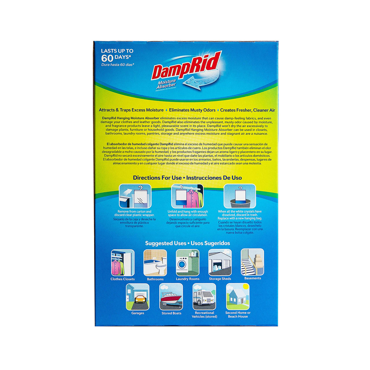 Damprid Hanging Bag Moisture Absorber Eliminates Excess Moisture That Causes Dampness, Musty Odors. Without Using Electricity, Its A Convenient, Effective Way To Remove Excess Moisture From The Air, Get Rid Of Stale, Musty Odors. The Hanging Bag Design Is Perfect For Closets, Laundry Rooms, And Storage Areas Where Clothes Often Collect Unpleasant Odors. Damprid Crystals Absorb Excess Moisture To Create And Maintain The Optimal Humidity Level Wherever Moisture Is A Problem. Each Dehumidifying Bag Can Last Up To 60 Days Depending On The Level Of Humidity And Temperature. When The Bag Is Finished, Simply Discard And Replace. Available In A Variety Of Scents Or In Fragrance Free. Not For Use In Moving Vehicles. Keep Out Of Reach Of Children. Read & Follow All Label Directions.