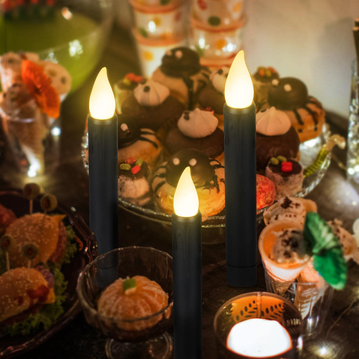 Halloween Floating Candles: Our Halloween Taper Candles(0.78'' D X 6.7'' H) Are Made Of High Quality Materials, Look And Feel Like The Real Candles.Standard Size Candle Bottom For Any Candle Base.It Is Also Possible To Hang Candles High In Ceilings, Porches, Etc. With Fishing Line. Create A Halloween Festive Atmosphere. Give Your Child A Festive Atmosphere Full Of Magic. | Remote And Timer Control:With10-Key Remotes, One Press To Control All Battery Taper Candles On/Off/Timer/Flickering/Brightness.Very Convenient For You To Control All Candle Lights.When You Hang It From The Ceiling Or Window.The Timer Function Saves Your Time To Turn Them On Or Off, It Will Also Save Energy To Extend Battery Life. | Safe & Battery Operated: The Flameless Led Taper Candle Requires 2 Aa Batteries(Battery Not Included). That Will Provide Up To 30 Days(Set A Timer For 6 Hours) Of Beautiful Ambiance.Battery Operated Candles Have No Drippings, Smoke, Allergies And Fire Hazards, Especially Suit For Families With Kids And Pets. | Perfect Decor:The Flickering Flame Is A Good Ideal For The Theme Party,Home ,Window, Church, Birthday, Wedding, Christmas Day, Halloween Decoration. It Can Also Be Used As Halloween Themed Party Decorations, Just Tie Them To The Ceiling With Fishing Line. | Package & Service:You Will Receive 12 Pcs Black Halloween Window Taper Candles+2Remote+ 1User Manual.Each Led Taper Candle Has Thoroughly Tested, If The Flameless Tapers Has Any Problem.Please Feel Free To Contact Our Customer Service, We Will Try Our Best To Help You.