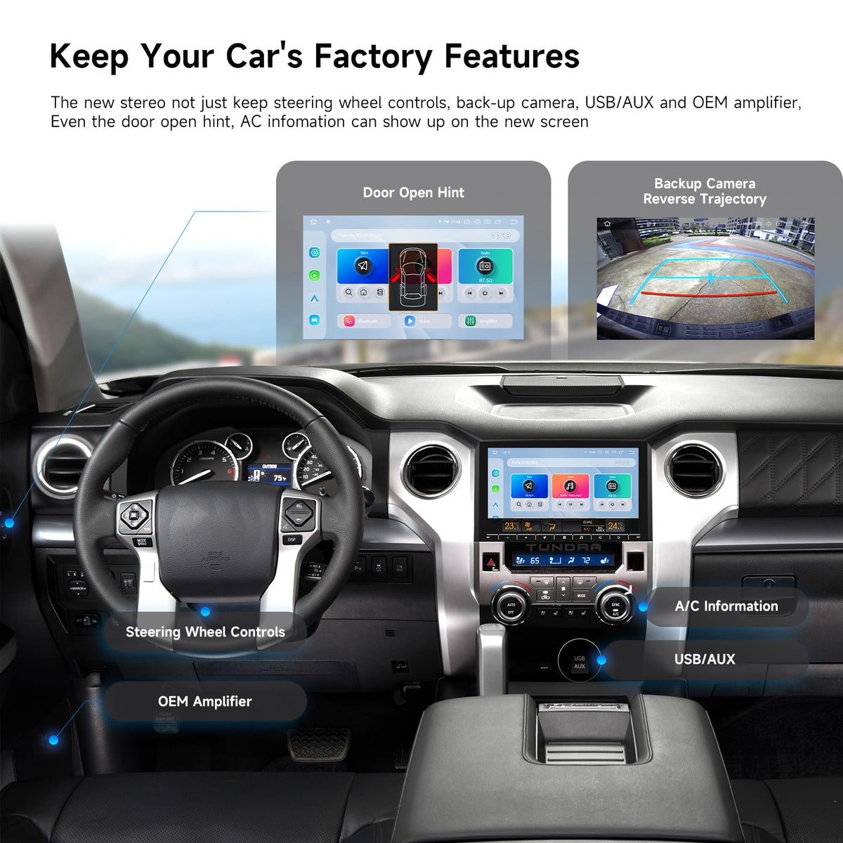 Q: How do I install the Dasaita Android 13 Car Stereo in my vehicle?A: Installation of the Dasaita Android 13 Car Stereo is straightforward with the included plug-and-play kit. It is designed to fit seamlessly into your Toyota Tundra's dashboard, allowing you to retain existing features like steering wheel controls and the factory audio system.