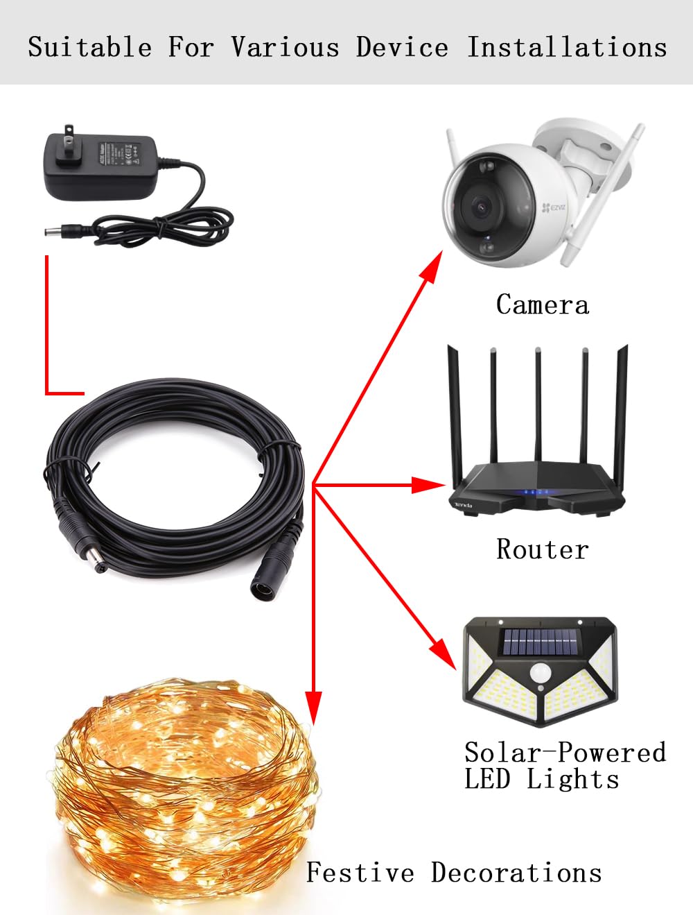 Q: How long is the DC Power Extension Cable?A: The cable measures 16.4 feet (5 meters) in length, providing ample reach for connecting devices in various setups.