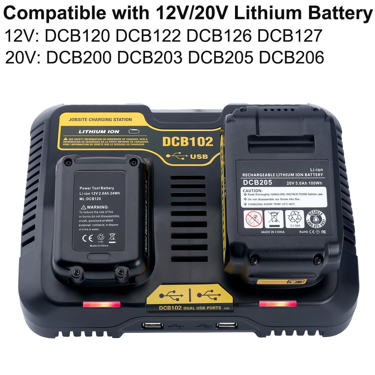 Specification: Input Voltage: 100V-240V, Ac Output Voltage: 12V/20V, Dc Battery Type: Lithium-Ion Usb Port: 5V/2.1A Dcb102 Charger Advantages: Compatible With 12V And 20V Lithium Battery. Can Simultaneously Charge (2) 12V Or 20V Lithium Batteries. With (2) Usb Charging Ports For Charge Your Cell Phones And Other Compatible Devices. Diagnostic With Led Indicator Light That Communicates Battery Charge Status. Advanced Charging Technology, Full Charge For 20V 6.0Ah Battery In 1.5 Hour Or Less. Note: Please Don'T Stay Battery On The Charger During Storage! Replacement For 12V-20V Battery Charger: Dcb102, Dcb102Bp, Dcb101, Dcb105, Dcb115, Dcb107, Dcb100, Dcb101, Dcb119 Compatible With 12V Lithium-Ion Battery: Dcb120, Dcb121, Dcb122, Dcb123, Dcb124, Dcb126, Dcb127 Compatible With 20V Lithium-Ion Battery Compatible With 20 Volt Battery Dcb200, Dcb201,Dcb203,Dcb204, Dcb206,Dcb207, Dcb208, Dcb209 Compatible With 20V/60V Batteries Dcb609 Dcb606 Dcb612 Package Includes: 1 * Dual Ports Battery Charger For 12V-20V/60V Max Li-Ion Power Tool Batteries