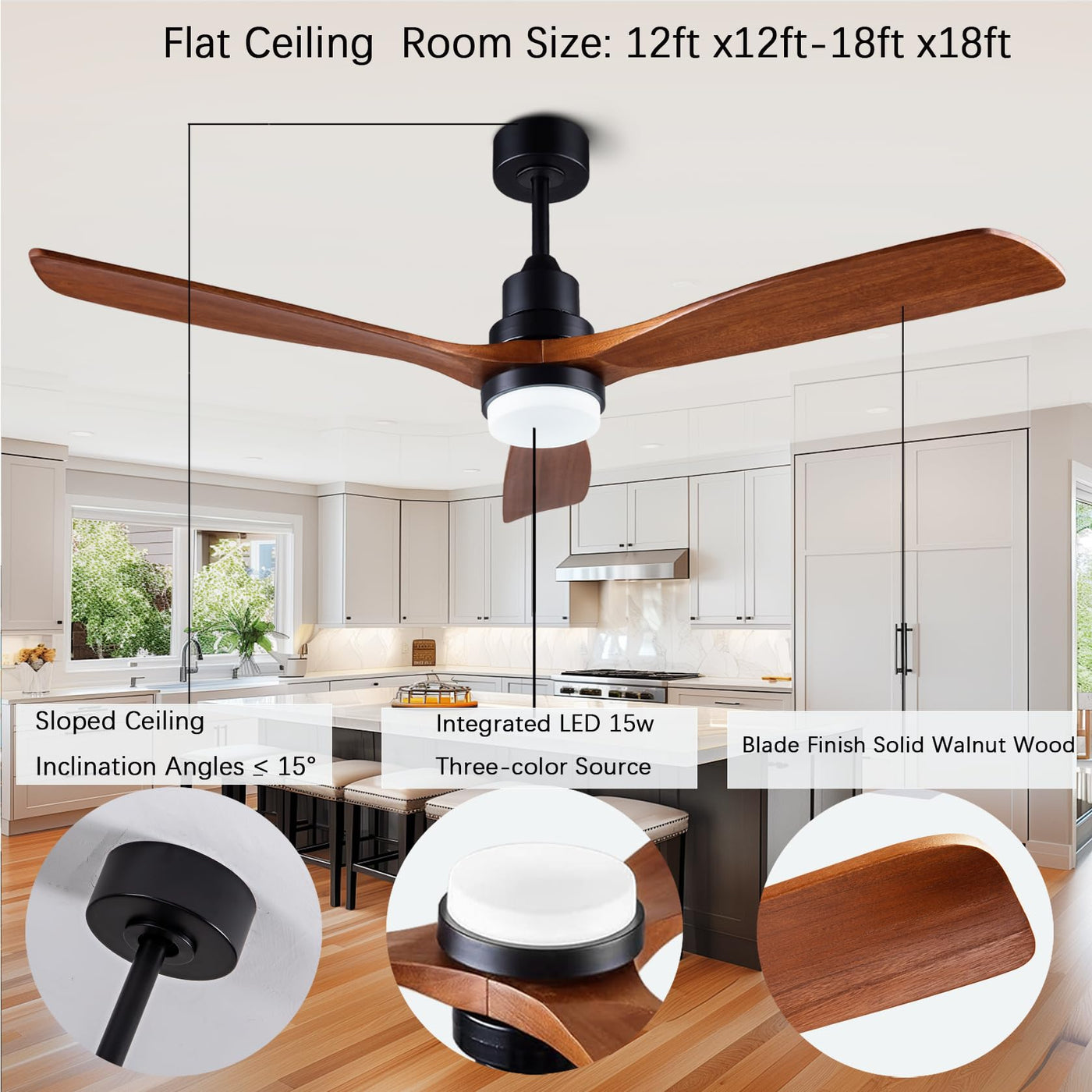 Q: What are the key features of the dearnow 56" Wooden Ceiling Fan?A: The dearnow 56" Wooden Ceiling Fan features three solid wood blades made from mahogany, a quiet DC inverter motor, adjustable LED light kit with three color temperatures, and a remote control for 6 speed settings and reverse rotation. It's suitable for both indoor and outdoor use.