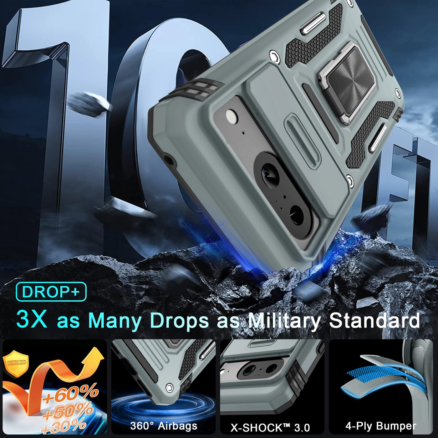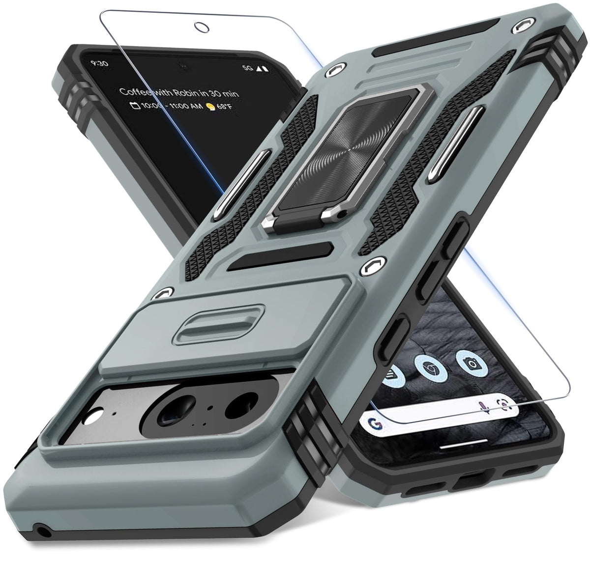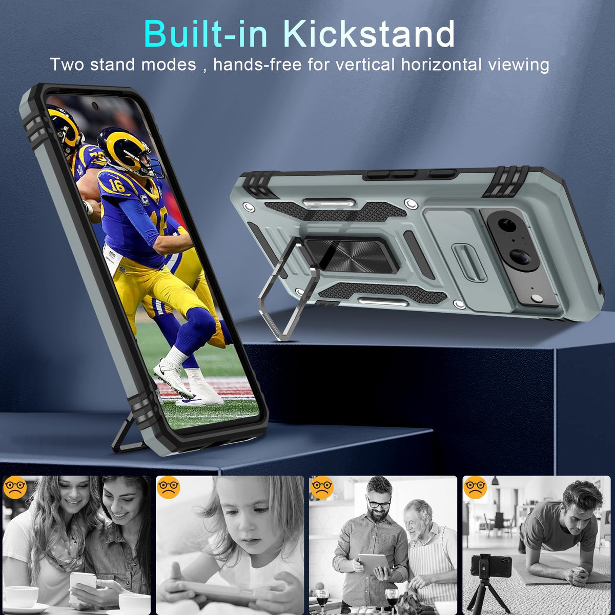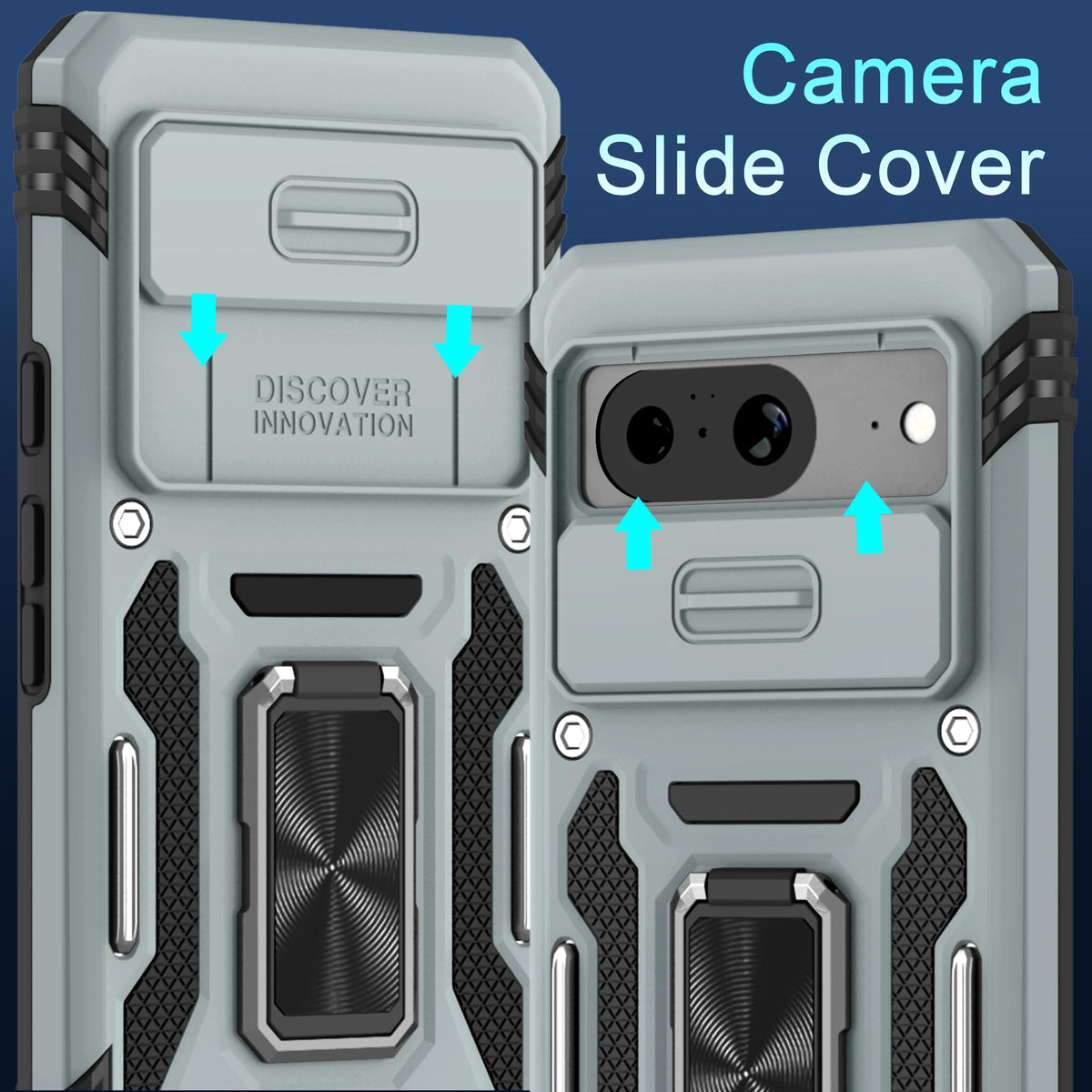 Deerlamn Case For Google Pixel 8 With Slide Camera Cover+Screen Protector (1 Pack), Rotated Ring Kickstand Military Grade Shockp