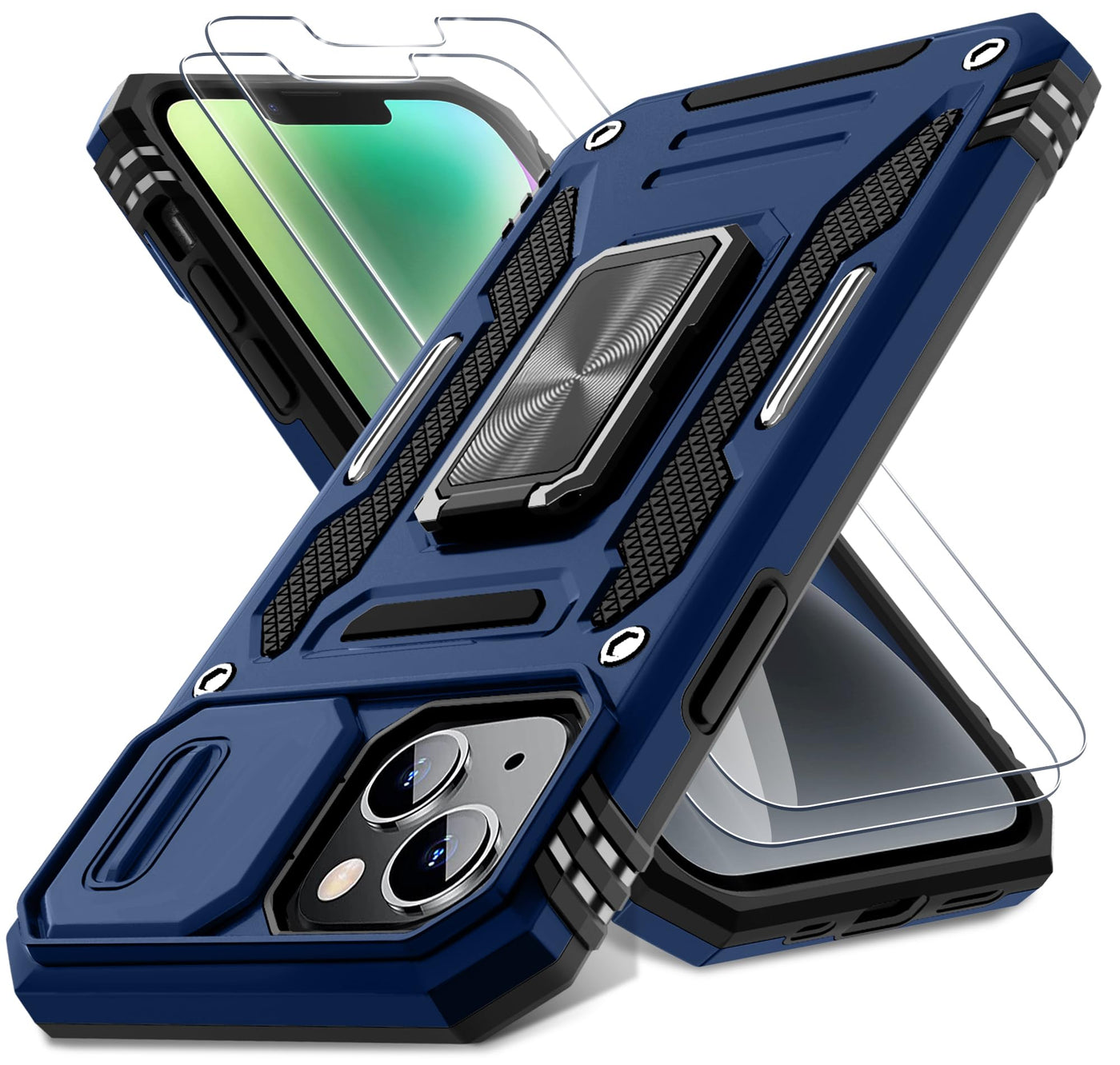 Deerlamn Case For Iphone 13/Iphone 14 6.1 Inch With Slide Camera Cover+Screen Protector(2 Packs),Rotated Ring Kickstand Military