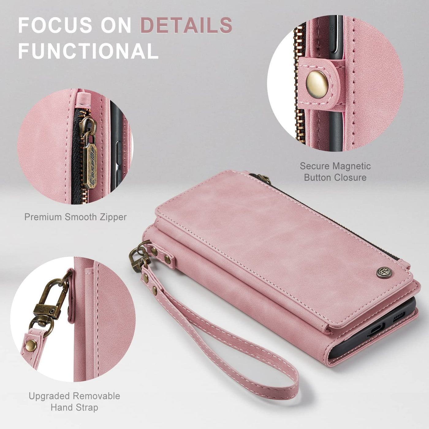 Q: How many cards can the wallet case hold?A: The wallet case includes 10 card slots, along with a zipper pocket and cash slots, providing ample storage for your essential items.